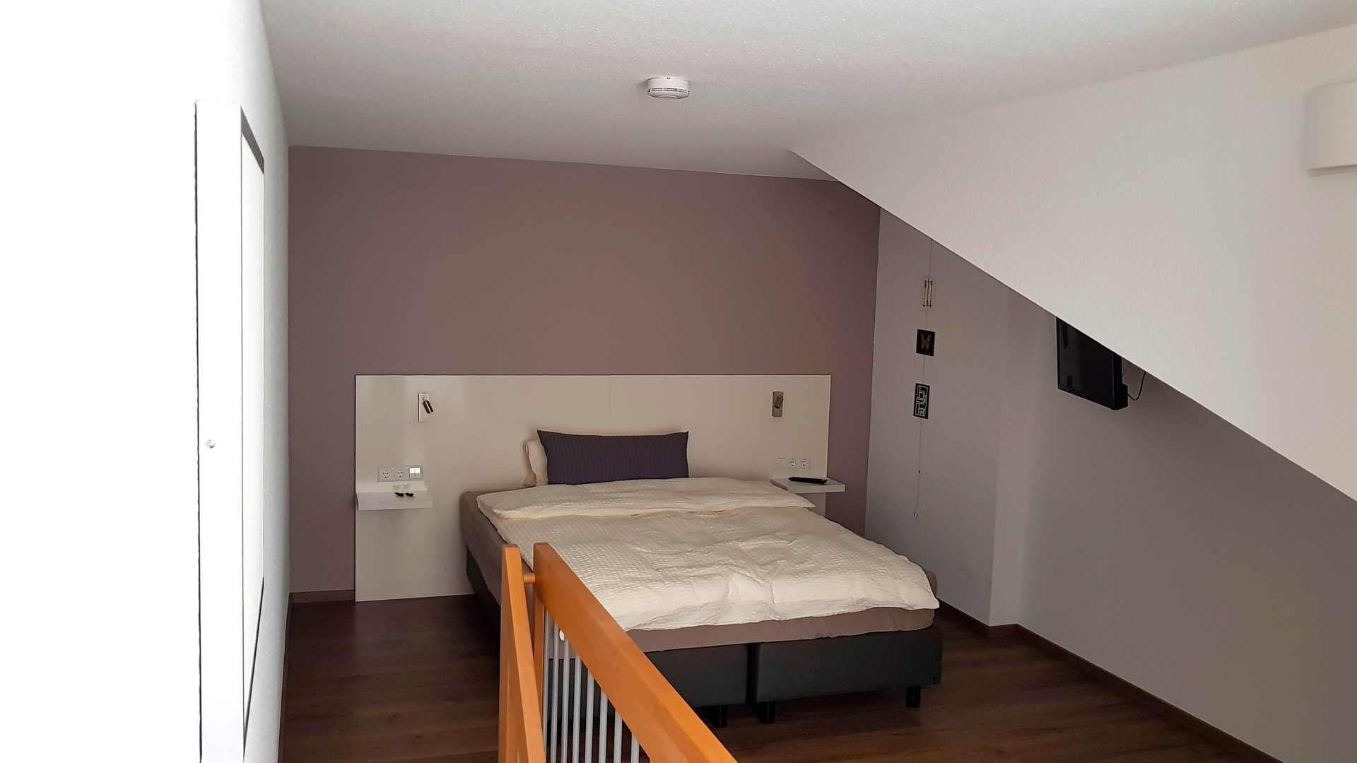 Über eine Treppe erreichen Sie das separate Schlafzimmer, das mit einem modernen Boxspringbett (160×200), einem Fernseher, einem großzügigen Kleiderschrank und Stauraum für Koffer ausgestattet ist. Das Badezimmer bietet eine begehbare Dusche, ein WC, ein Waschbecken und einen geräumigen Unterschrank.