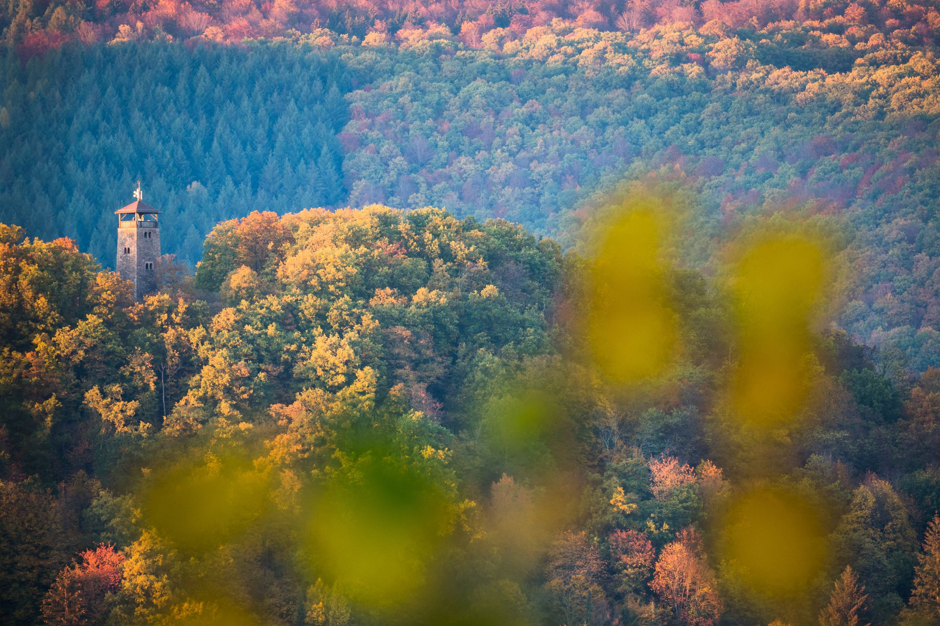 über einen ca. 200 m langen, ansteigenden Waldweg lohnt sich allemal. Auf dem Rundweg weiter laufend erreichen Sie kurz nach der Abzweigung zum Turm den östlichen Zugang zum Rundweg über etliche Treppen vom Jahnplatz her. Während Sie weiterhin dem „roten R“ folgen, gelangen Sie ein wenig bergab auf die Nordseite des Ohrsbergs. Hier wandern Sie oberhalb der Bebauung des „Neuen Wegs“ auf ebener Strecke weiter, bis Sie über einen Treppenweg den Ausgangspunkt am Panoramaweg erreichen.