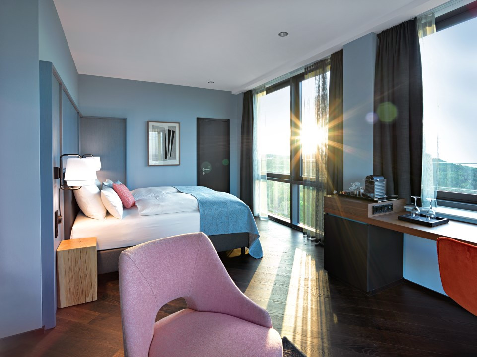 Übernachte in den Doppelzimmern, die den Komfort eines 4-Sterne-Hotels beinhalten. Modernes Design und freche Akzente schaffen sofort eine Wohlfühlatmosphäre. Die Zimmer verfügen über Doppelbetten mit 180 cm Breite, eine kostenfreie Minibar, SAT-TV und kostenlosen Zugang zu Glasfaser-Highspeed-Internet. Im Badezimmer gibt es eine Dusche mit WC, Fön und Kosmetikspiegel. 18 Zimmer sind als Twin Bed Zimmer eingerichtet, in denen du die beiden Einzelbetten wahlweise zusammen- oder auseinanderstellen kannst.