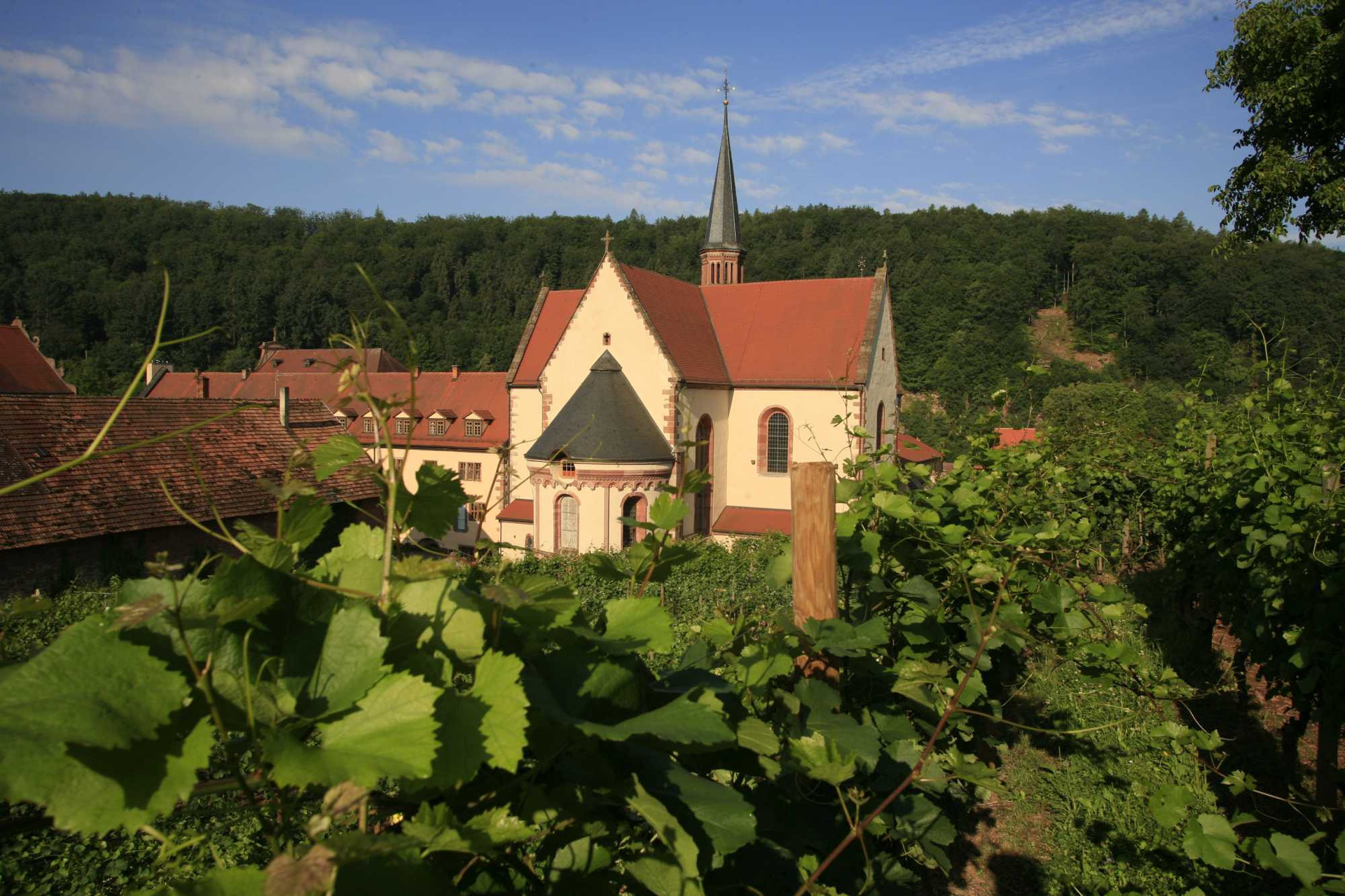 Unterwegs siehst du den historischen Weinberg mit seinen Terrassen. Durch stillen Wald geht’s weiter zum Kloster Bronnbach. Der Panoramaweg biegt hier bergauf zum Schafhof ab – du kannst aber den kurzen Abstecher ins Kloster machen: romanisch-gotischer Kreuzgang, barocker Josephs- und Bernhardssaal, Orangerie (Restaurant), die Vinothek Taubertal im Keller und das Gästehaus Bursariat. Vorbei am Kloster (per kleinem Abstecher erreichbar) führt dich der Weg auf die Höhe, an aufgelassenen Terrassenweinbergen vorbei und durch Feldfluren bis Reicholzheim.