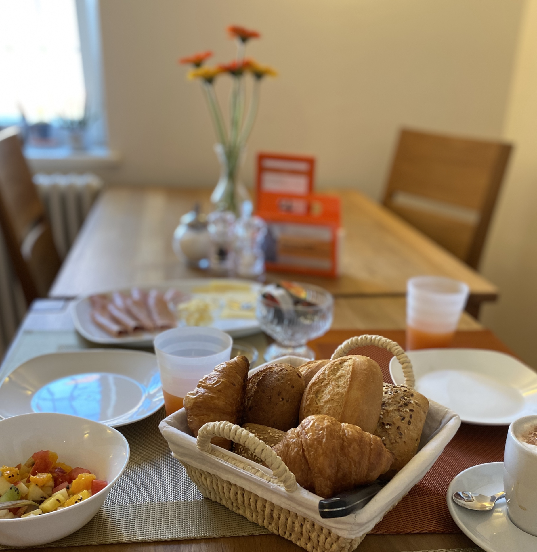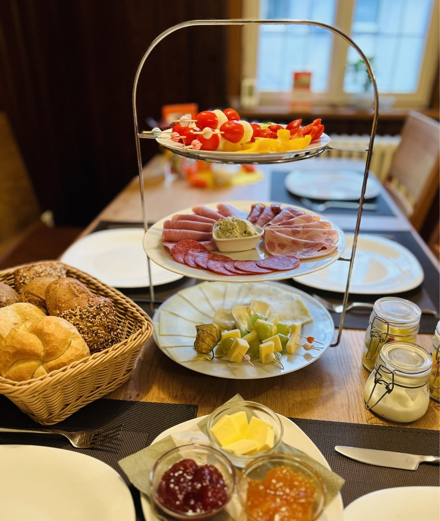 Das dazugehörige, liebevoll gestaltete Kaffeehaus bietet auch "Nicht-Hotel-Gästen" ein reichhaltiges Frühstücksbuffet. Dabei wird viel Wert gelegt auf die regionale Herkunft der Produkte. Die schöne Außenterrasse lädt zwischen einer alten Steinmauer und den vielen Blumen zum Wohlfühlen ein.