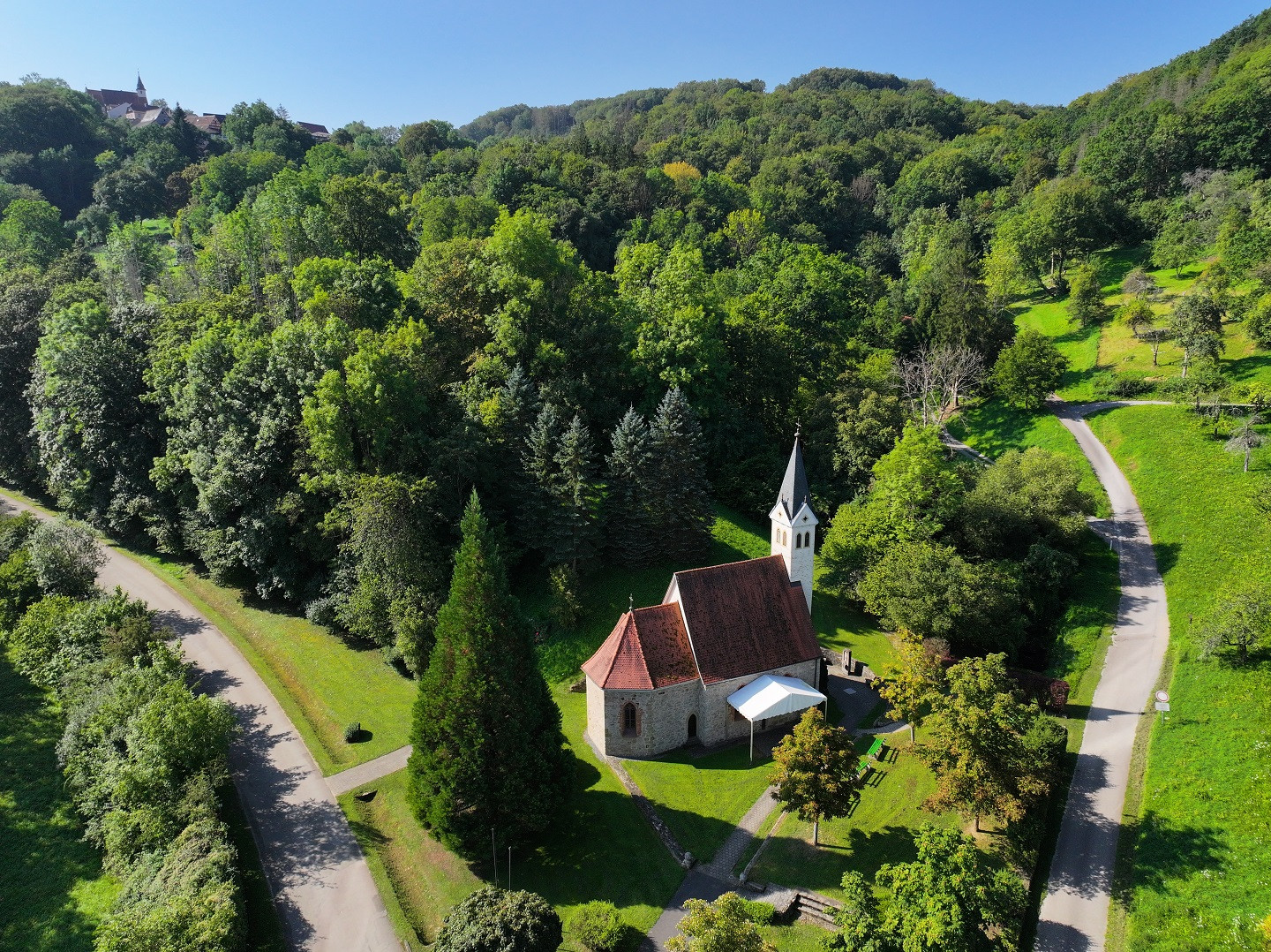 Über einige Stufen geht es hinab zur Obertor-Straße und zum Feuerwehrmagazin. Wandere weiter in Richtung Heßlachshof. Nach wenigen Minuten durch den lichten Wald taucht die kleine Kapelle auf. Hier bietet sich eine letzte Gelegenheit, kurz zur Besinnung zu kommen.