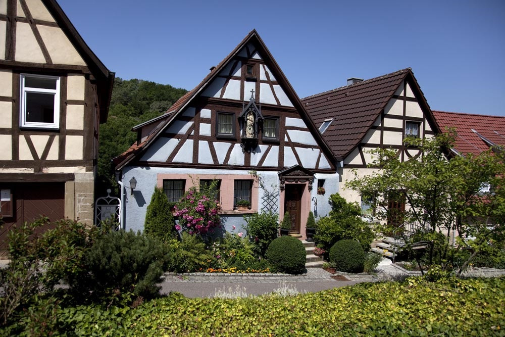 Am Fuß der St. Burchard-Kirche steigst Du die barocken Treppen hinauf und gehst am mächtigen Pfarrhaus aus dem Jahr 1614 vorbei. Gleich daneben lädt eine kleine Tuffsteingrotte zum kurzen Verweilen ein, bevor du zur imposanten Zehntscheune weitergehst.