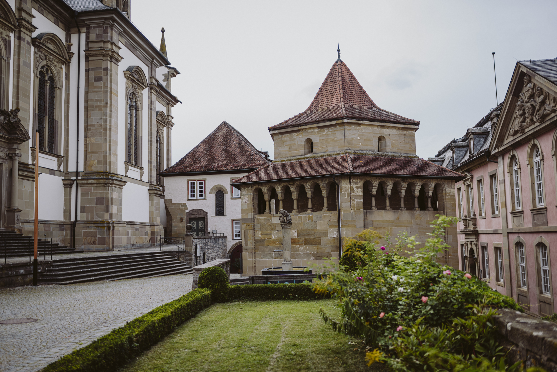 Über den Kleincomburger Weg geht es jetzt rechts steil bergauf zur Kleincomburg. Diese romanische Basilika mit einschiffigem Chor kann leider nicht besichtigt werden. Oben angekommen haben Sie auch einen wunderbaren Blick auf die Großcomburg und die Schwäbisch Haller Altstadt.