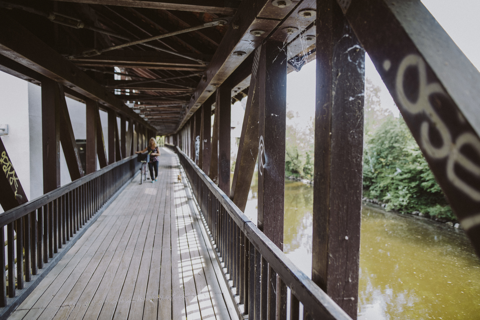 Auf dem Kocher-Jagst-Radweg verlassen Sie die Altstadt von Schwäbisch Hall flussaufwärts durch den Stadtpark Acker anlagen bis zu dessen Ende auf Höhe des Festplatzes/Parkplatzes im Vorort Steinbach. Hier geht es über eine überdachte Holzbrücke links ab in den Ort und gleich wie-