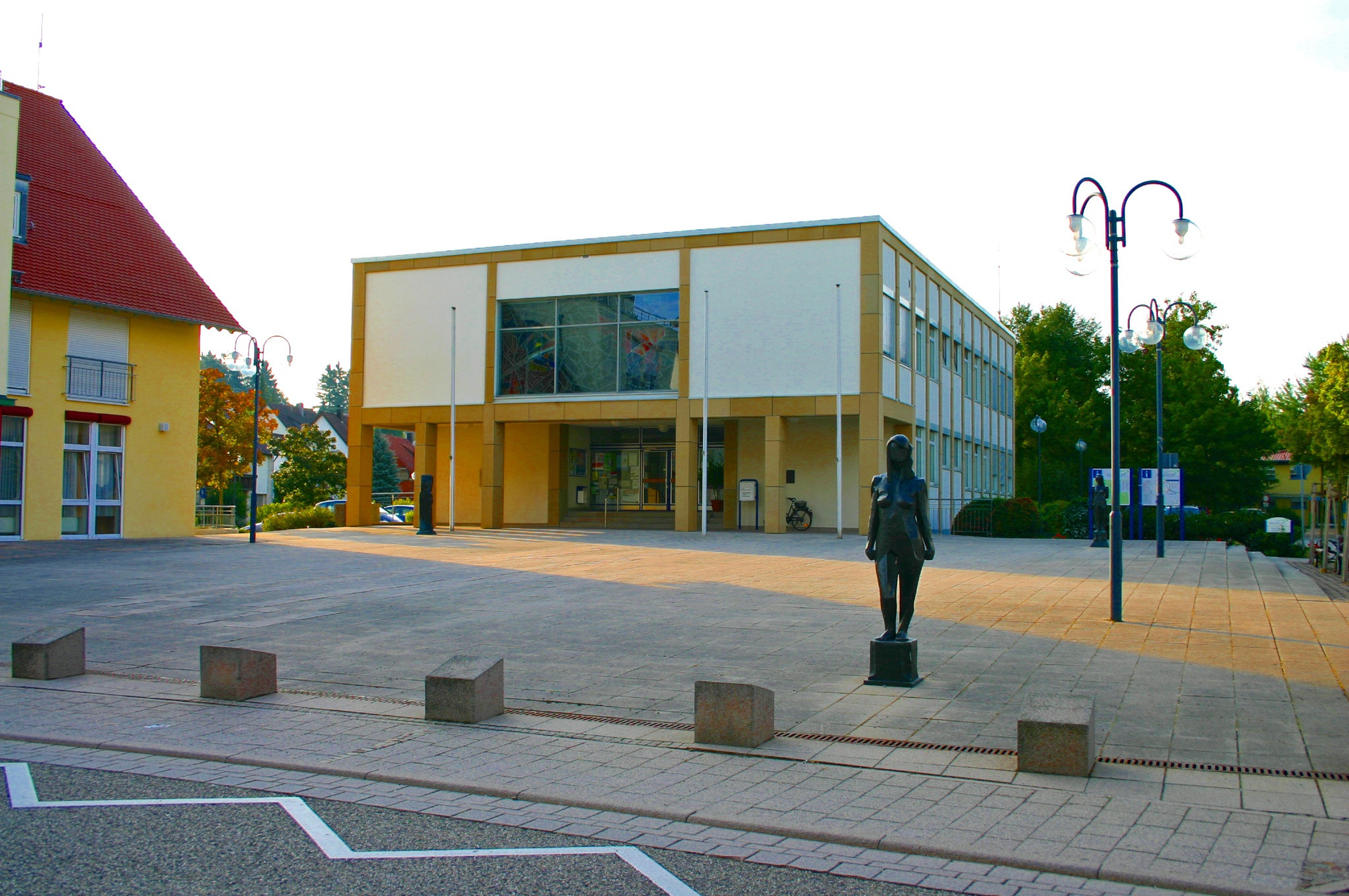 Der modern gehaltene Rathausplatz wurde Mitte der 1990er neu gestaltet. Drei Bronzestatuen des Künstlers Günter E. Hertle ragen heraus.