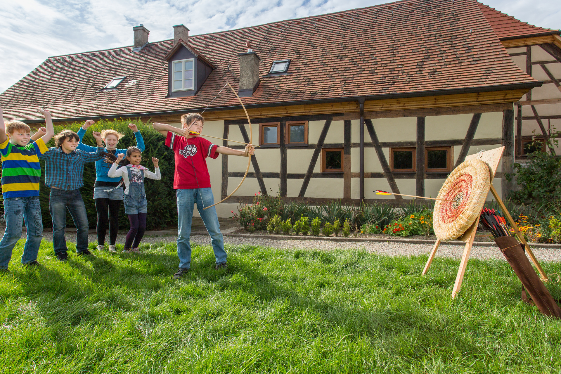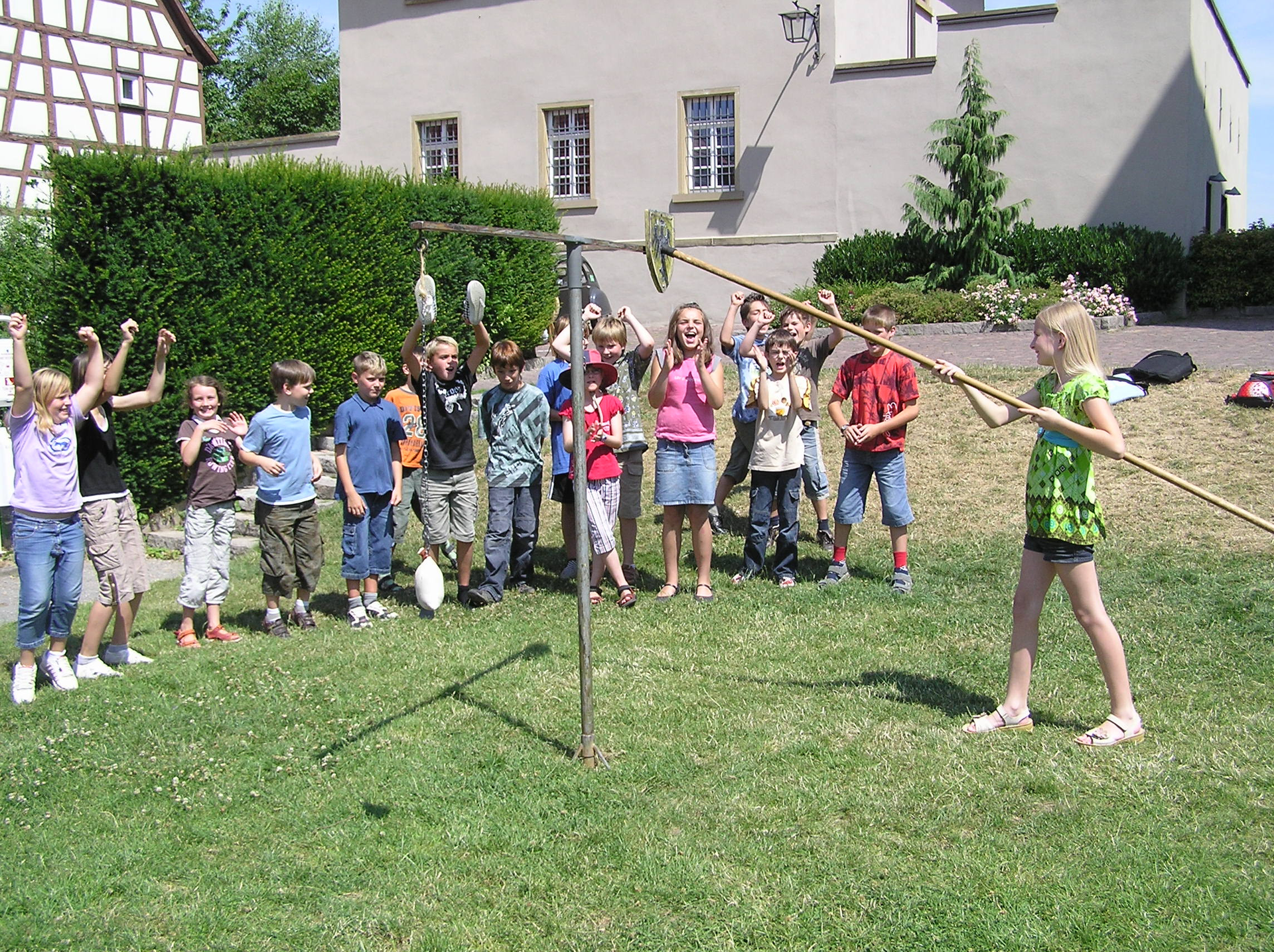 Im Anschluss können die Kinder selbst aktiv werden und an verschiedenen historischen Spielen teilnehmen, darunter Bogenschießen, Lanzenstechen und Wackelstäbe. Diese spielerischen Wettkämpfe fördern Geschicklichkeit, Koordination und Teamgeist.