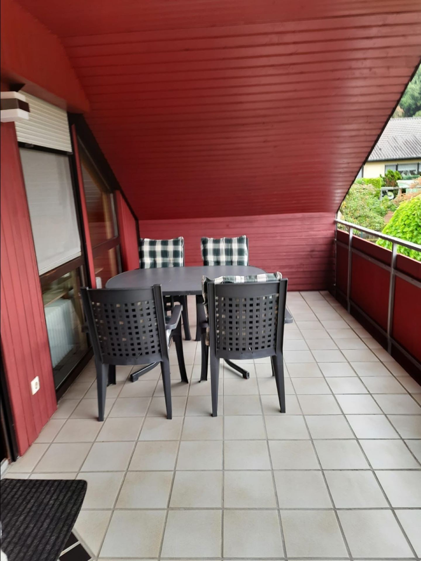 Vom überdachten und möblierten Balkon genießt du einen herrlichen Blick über die Dächer Unterheimbachs und die umliegenden Weinberge.