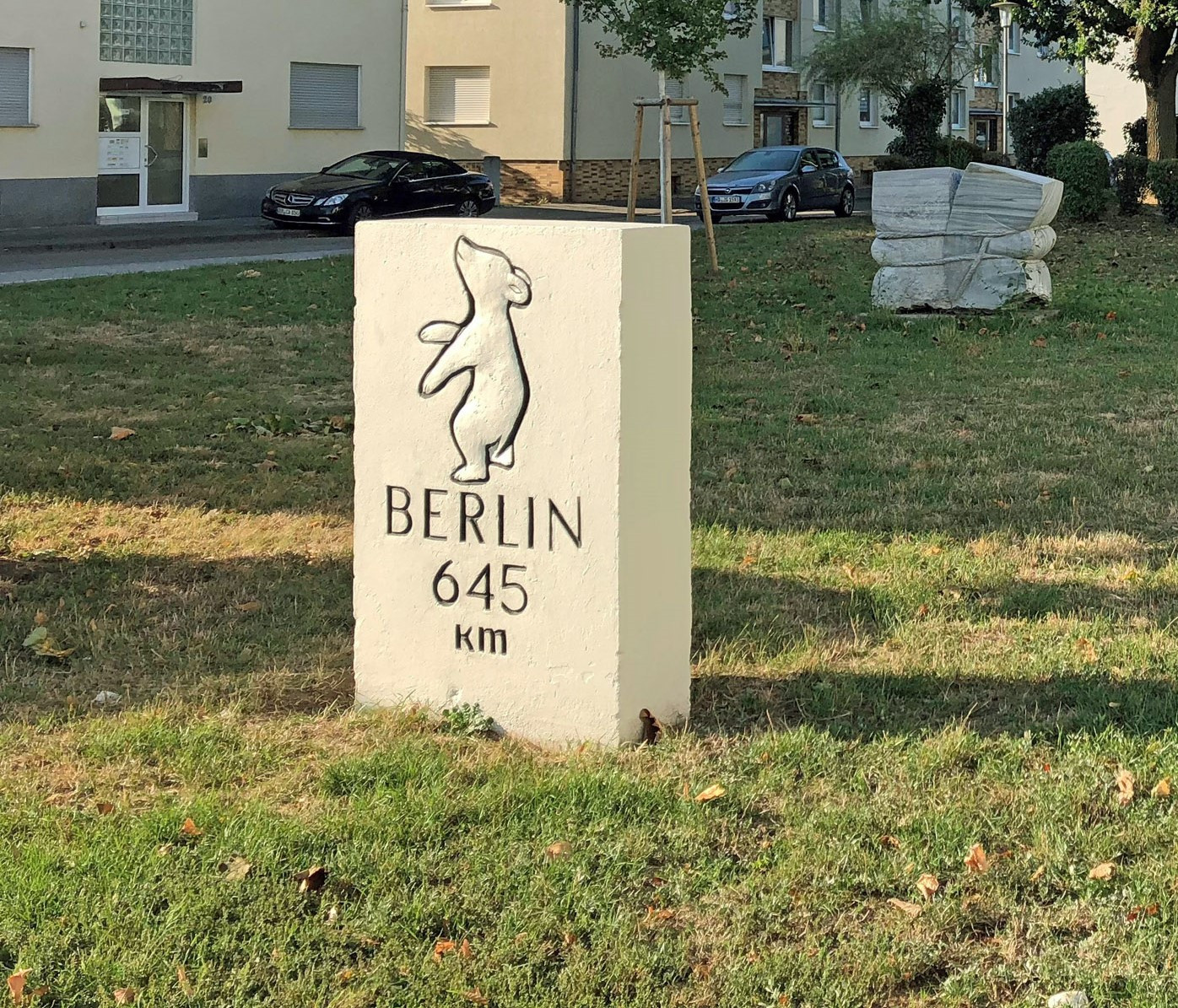 Schwetzingen ist Teil eines bundesweiten Netzwerks an Meilensteinen, zu dem der Berlin-Beauftragte der Bundesregierung, Gerd Bucerius, Mitte der 1950er Jahre aufrief. Diese tragen eine Umrisszeichnung des Berliner Bären der Bildhauerin Renée Sintenis. Daneben ist die Distanz in Kilometern zur damaligen Hauptstadt des dreigeteilten Deutschlands aufgeführt, vielmehr zum dortigen Dönhoffplatz, auf dem die Kopie des Preußischen „Null-Meilensteins“ (1730) steht.