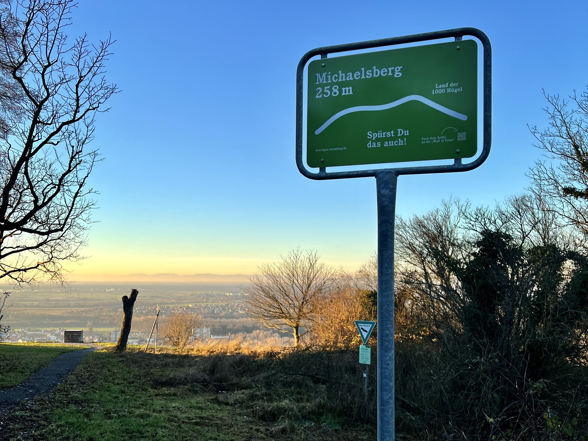 Die zweite Schleife der Acht führt weiter Richtung Weingarten. Im Café Auszeit lässt sich bei Bedarf ein weiterer Stopp einlegen (Montag Ruhetag). Anschließend wird es nochmals sportlich: Der Anstieg zum Michaelsberg bei Bruchsal bietet die Möglichkeit, am offiziellen Hügel-Passschild einen zusätzlichen Höhenmeter-Akzent zu setzen – inklusive Aussicht, Passselfie & Wall of Fame.