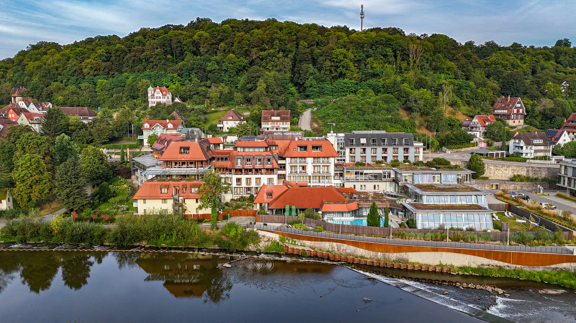 Ziegeldächer des Ringhotel Hohenlohe am Kocherufer zum Stadtbild von