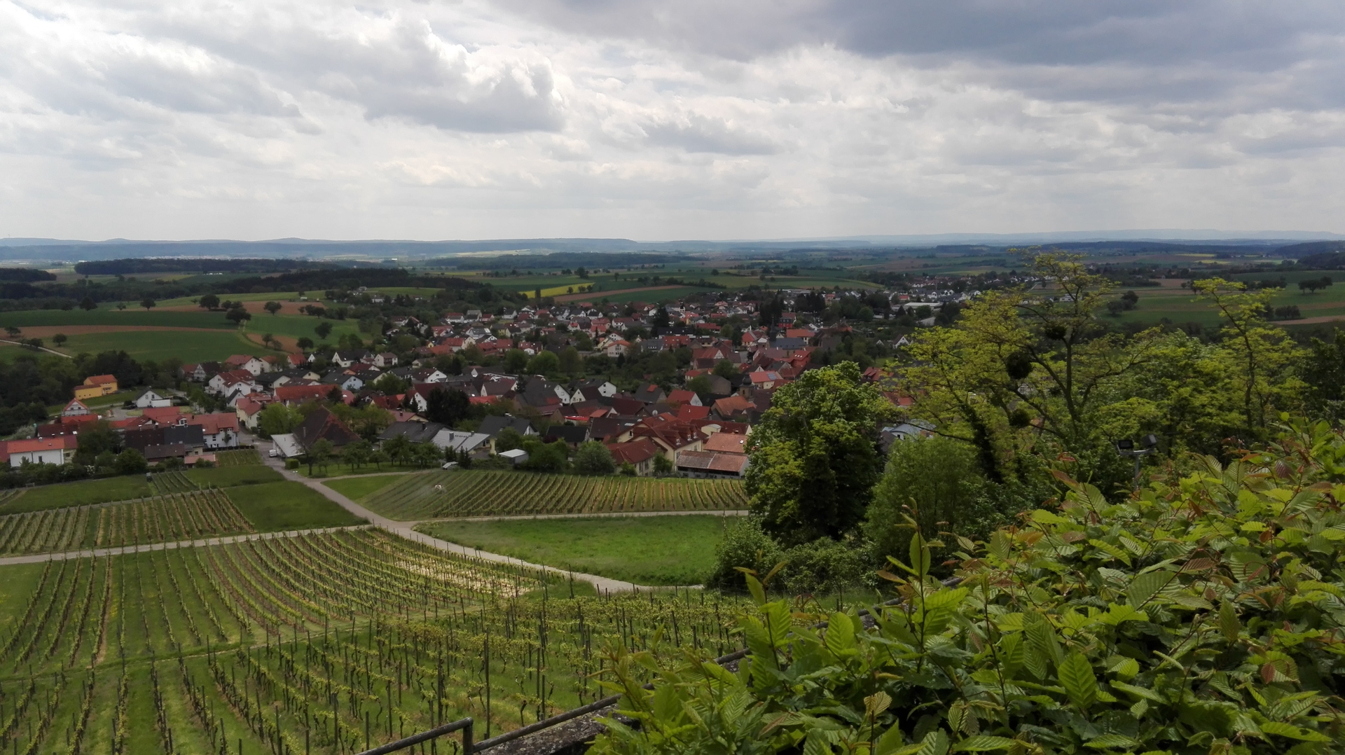 Wir umrunden die Burg durch die Weinberge bevor wir den gleichen Rückweg nach Steinsfurt nehmen. Unterhalb einer querverlaufende Hochspannungsleitung nehmen wir rechts eine kleine Abkürzung. Am Bahnübergang von Steinsfurt treffen wir wieder wieder auf die Rundtour.