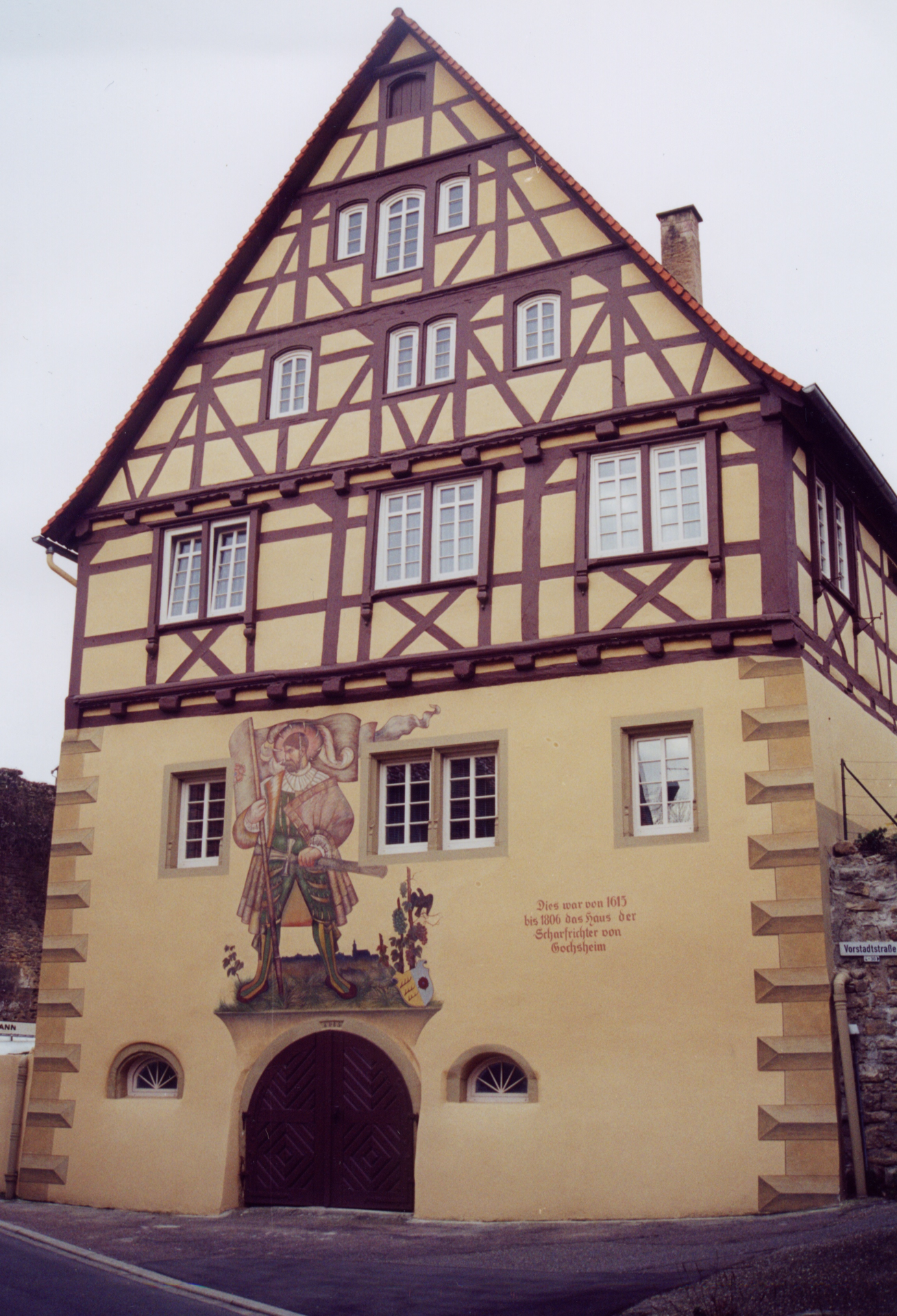Dieses Haus von 1615 ist das älteste Wohnhaus Kraichtal-Gochsheims, das als einziges den von Franzosen systematisch angelegten Brand von 1689 überdauert hat. Das Wandbild wurde etwa 1920 gemalt, ein älteres Bild war damals nur noch schemenhaft zu erkennen. Am gleichen Standort gab es bereits 1518 einen Vorgängerbau der Gochsheimer Scharfrichter, der somit vor der Stadtmauer stand, da die Vergrößerung der Stadt durch die Vorstadtmauer erst ab 1600 erfolgte.