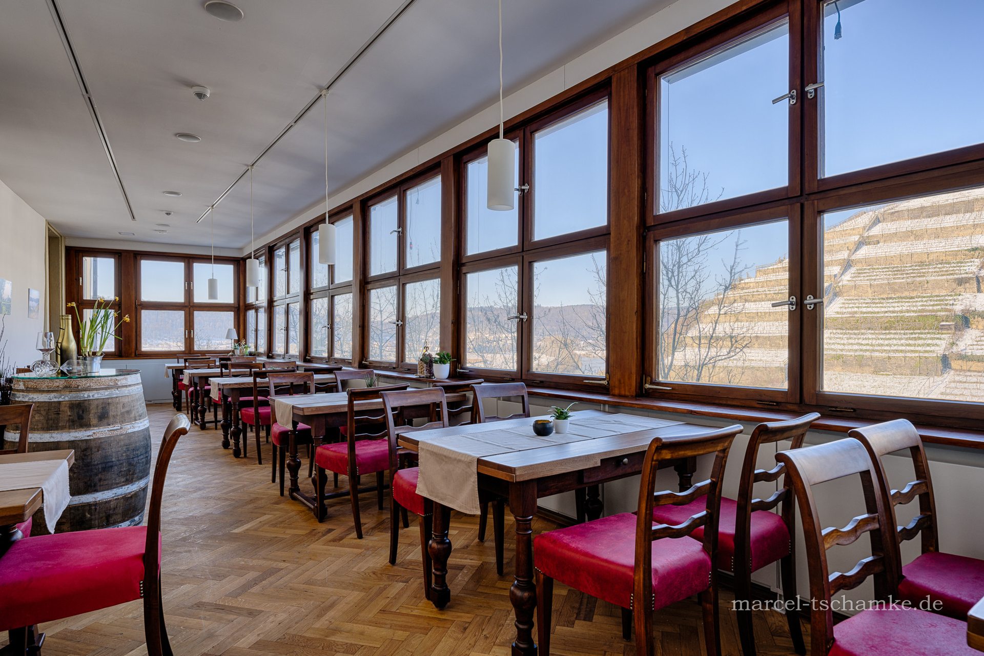 Zum Frühstück gibt es Buffet in Ritter-Atmosphäre mit herrlichem Blick in die umliegenden Weinberge im Gundelsheimer Himmelreich, ein imposantes Steillagen-Areal am Neckar. Die Pause am Nachmittag lässt sich mit toller Aussicht im Café auf der Schossterrasse verbringen.