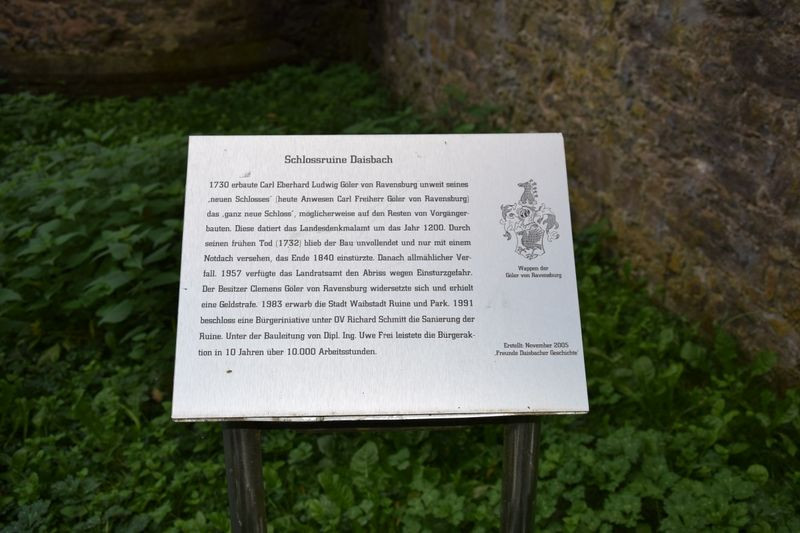Die Daisbacher Burg, heute Schlossruine, wurde erstmals im Jahre 1366 erwähnt, damals war sie im Besitz der Herren von Venningen. Im Dreißigjährigen Krieg wurde die Wasserburg durch einen Brand zerstört und der obere Teil erst 100 Jahre später, im Jahre 1730, neu aufgebaut.
