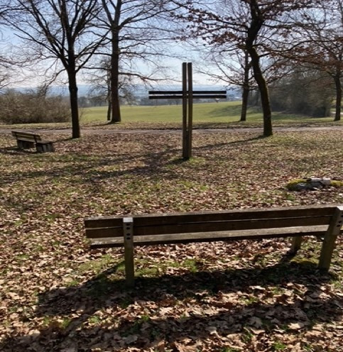Auf den Bänken mit Rückenlehne lässt es sich verweilen und den Blick schweifen lassen. Direkt daneben steht ein schlichtes Kreuz, der dem Ort eine besondere Ruhe verleiht. Zu jeder Jahreszeit öffnet sich hier eine wundervolle Aussicht.