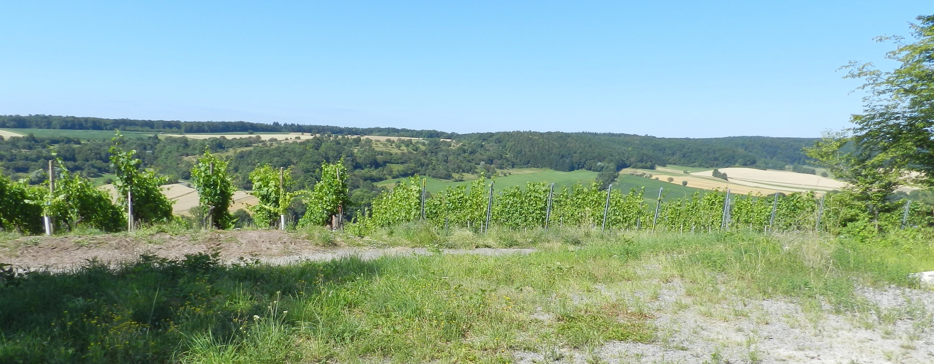 Töpfergasse zurück hinauf zum Ausgangspunkt der Tour (Parkplatz Heiligenbergsee). Von dort aus verabschiedet sich die Tour mit einem atemberaubendem Blick über Weinberge, Wald und Felder in Richtung oberes Kirbachtal.