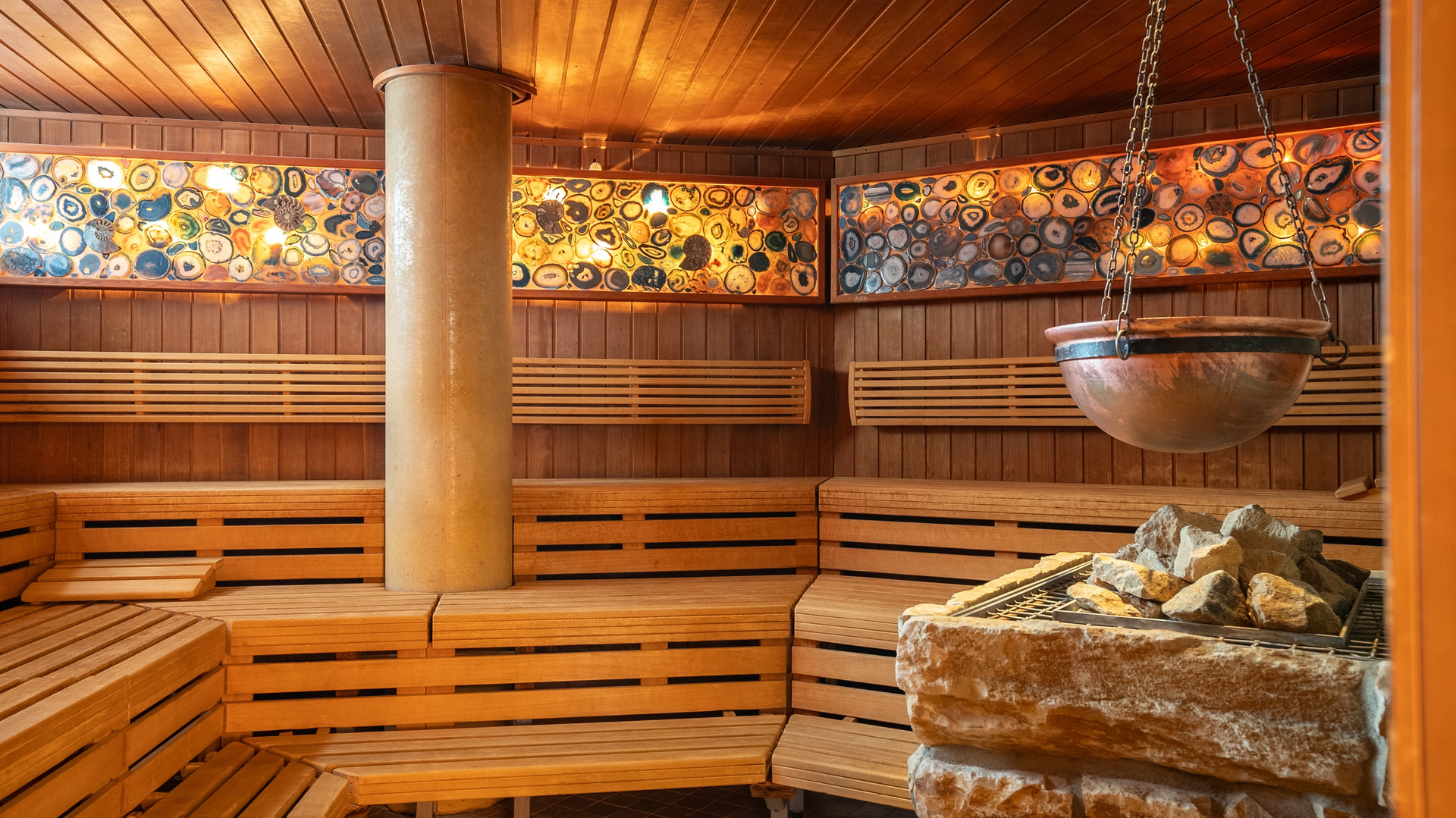 In der über zwei Stockwerke verteilten Sauna-Erlebniswelt sorgen acht verschiedene Schwitz- und Wohlfühlkabinen, eine Tee-Lounge und die große Freiterrasse für Abwechslung. Besonders beliebt ist die Panorama-Sauna, in der ungestört entspannt werden kann.
