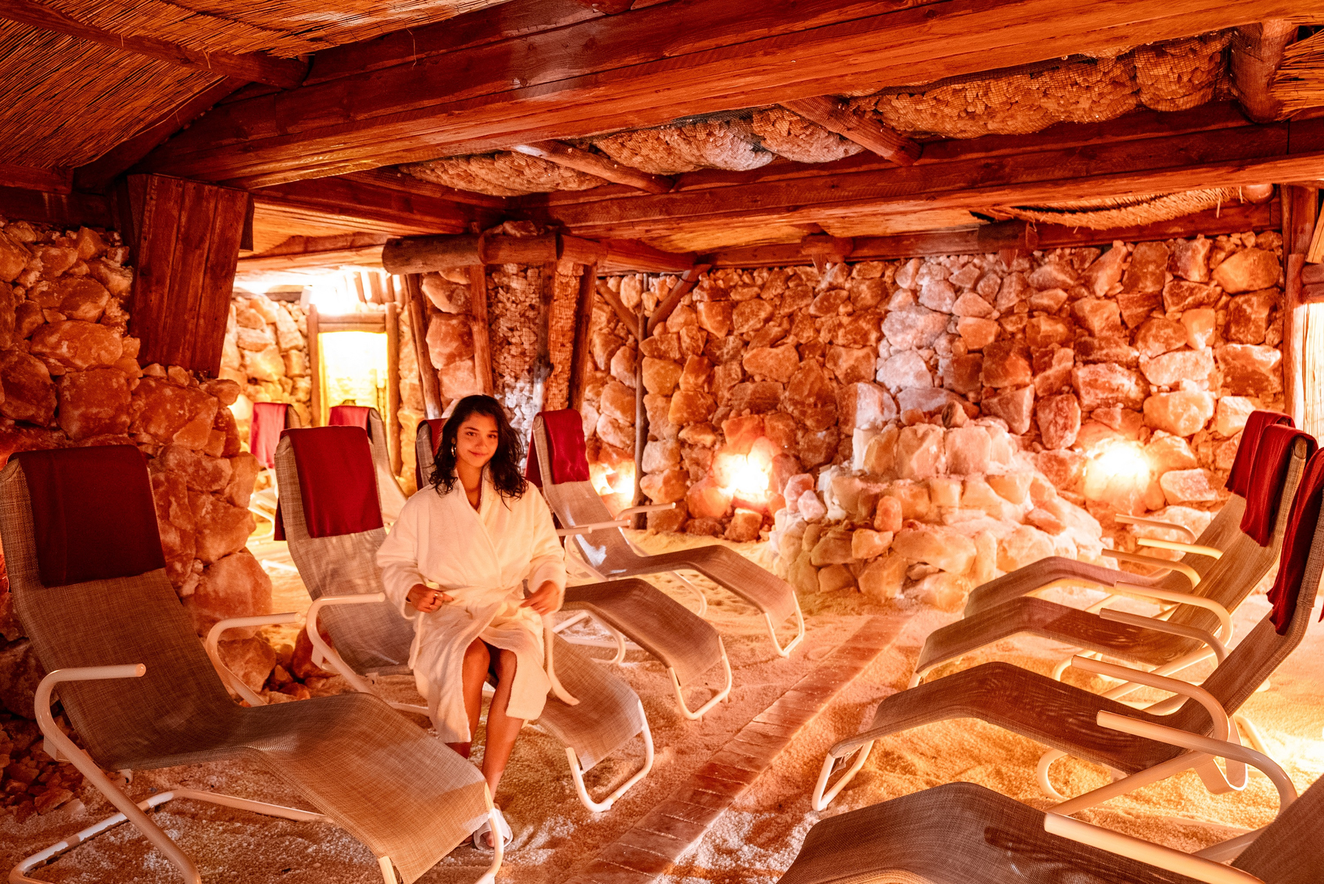 - Eine große Salzgrotte und eine Familiengrotte mit einem wahren Schatz an wertvollen Mineralstoffen. Diese können separat vom Solbad und der Saunawelt benutzt werden.
