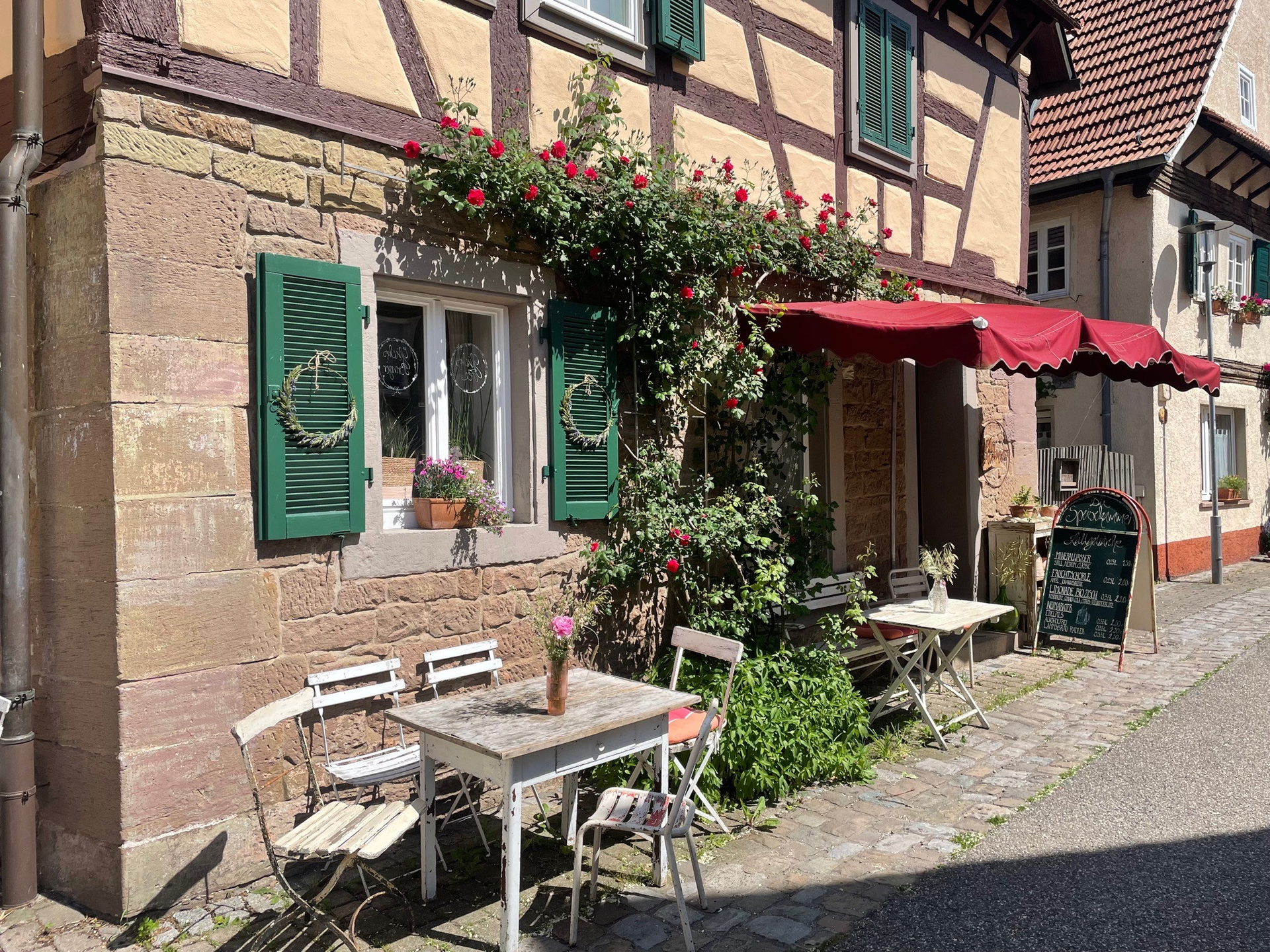 An warmen Tagen auch gerne in unserem gemütlichen Außenbereich mit Blick auf die bezaubernde Fachwerkstraße von Diefenbach.