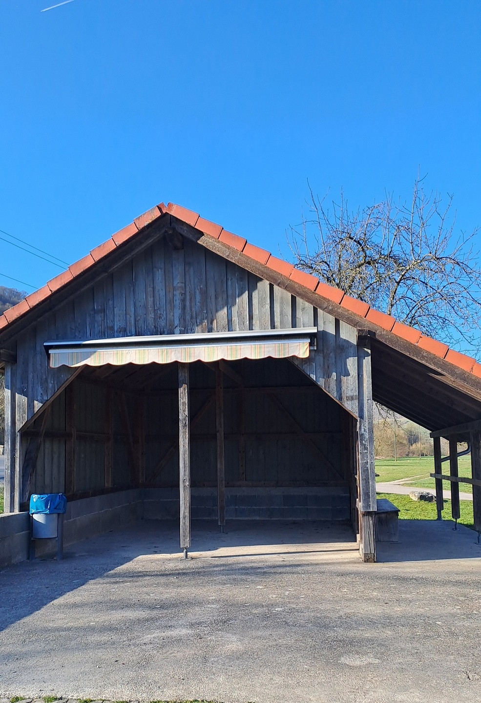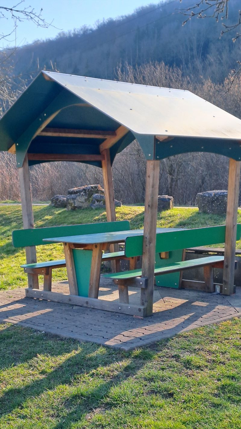 Nur etwa 100 Meter vom Kocher entfernt erwartet dich ein idyllischer Ort mitten in der Natur. Eine überdachte Sitzgelegenheit und eine kleine Hütte bieten Schutz bei jedem Wetter, hier kannst du dich wunderbar ausruhen oder eine Pause mit Freunden und Familie genießen.