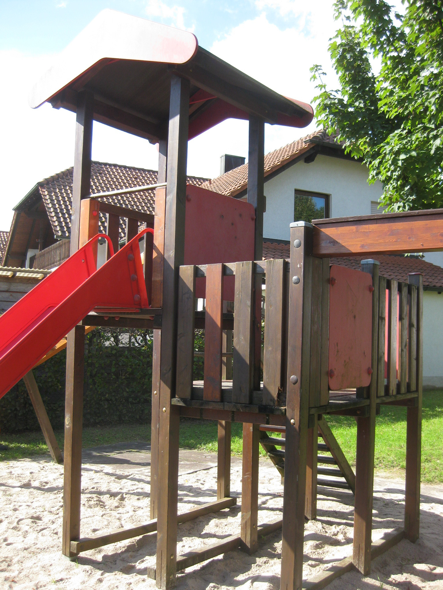 Wipptiere, Spielturm mit Rutsche und Hangelsprossen, Schaukel mit Kettenschaukel und Kleinkinderschaukel, Stehkreisel, großer Sandkasten ausreichend Sitzgelegenheiten, etwas von der Straße zurück gelegen - Zugang scheinbar über Privatweg.