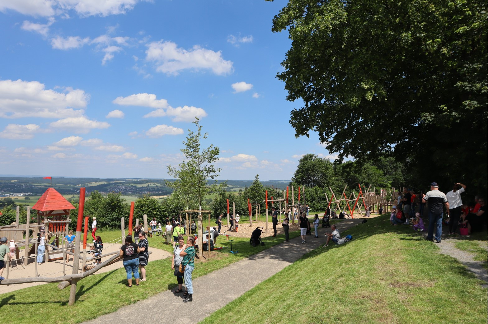 Der moderne Spielplatz bietet Kindern die Möglichkeit, die Erlebnisse ihres Besuchs der Burg Steinsberg spielerisch zu verarbeiten. Auf einer Fläche von rund 3.300 Quadratmetern wurde das Konzept eines Mehrgenerationenspielplatzes verwirklicht. Neben vielfältigen Spielangeboten für Kinder stehen auch spezielle Angebote für Seniorinnen und Senioren zur Verfügung. Kletter- und Balanciergeräte sind so gestaltet, dass sie von allen Generationen gemeinsam genutzt werden können. Schaukeln sowie ein separater Kleinkindbereich ergänzen das Angebot. Zahlreiche Sitzgelegenheiten auf dem gesamten Gelände laden zum Verweilen ein.