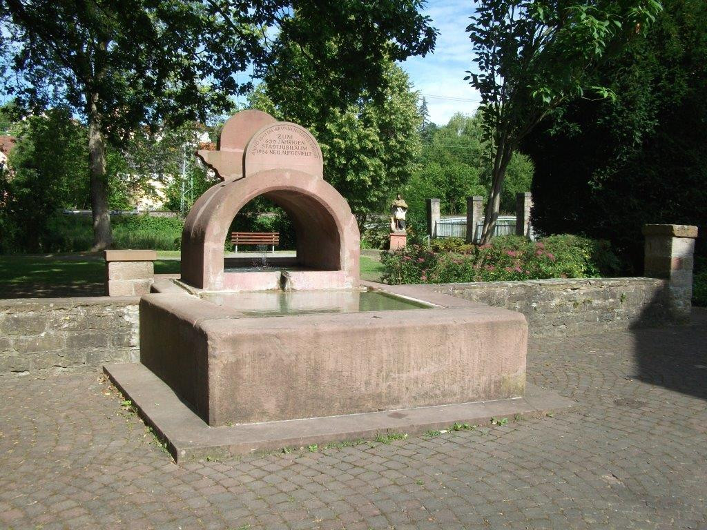 Der Brunnen mit typischen Renaissanceformen stand bis 1956 auf der Westseite der Brunnenstraße. Das Wappenschild zeigt das Mainzer Rad. Die Inschrift verewigt die Namen des damaligen Zentgrafen, der beiden Bürgermeister und der Räte.