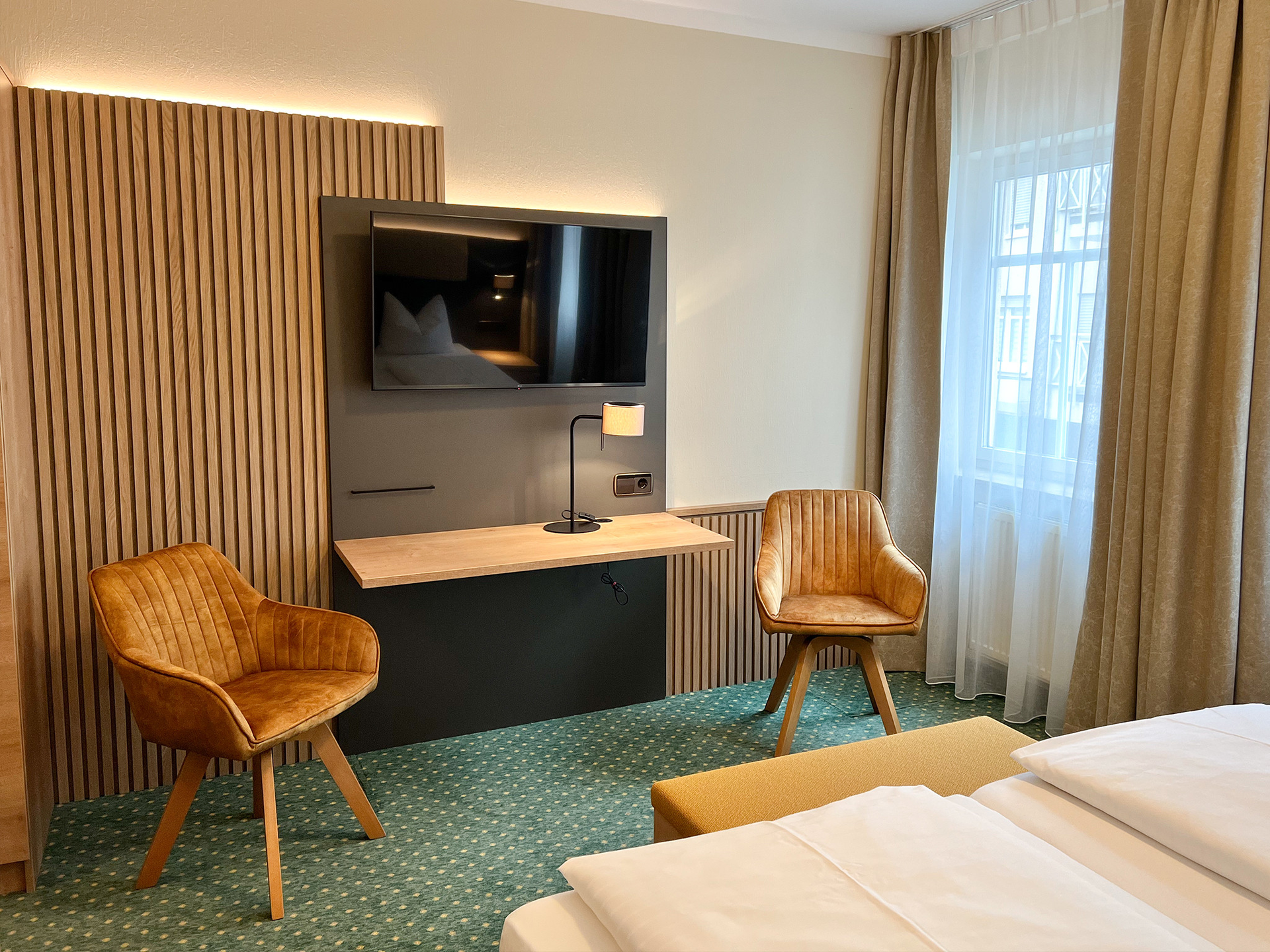 Unsere modern eingerichteten Zimmer verfügen alle über Dusche/Bad, WC, Haartrockner, Kabelfernsehen, Radio, Telefon & Minibar sowie W-Lan Zugang.