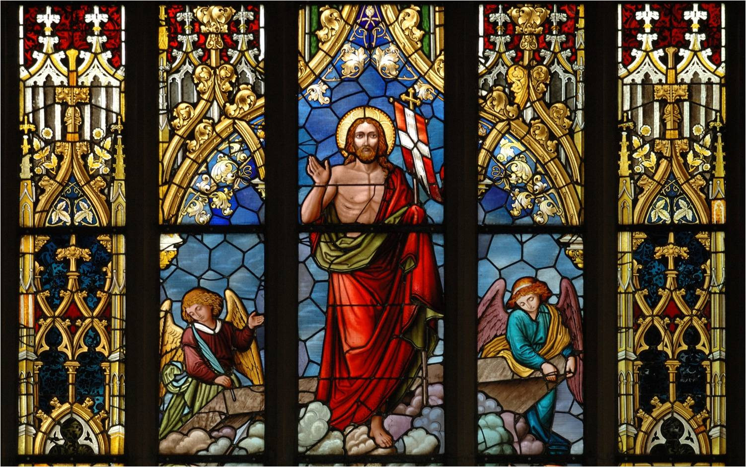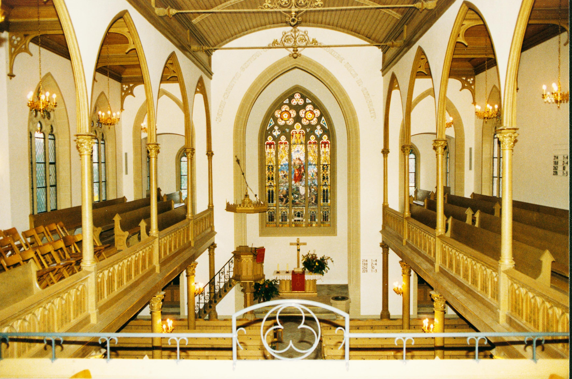 Im Chorraum an der Ostseite fällt das große, spitzbogige und fünfbahnige Chorfenster mit gotisierendem Maßwerk auf. Es zeigt die Auferstehung Christi im Stil der Schule der Nazarener, ein Werk des Heidelberger Glasmalers H. Beiler. Beachtenswert ist auch eine künstlerisch wertvolle Unterglasmalerei der israelischen Künstlerin Paula Mautner, die einen gotischen Christus darstellt. Der Taufstein stammt noch aus der Vorgängerkirche (ca. 1500).