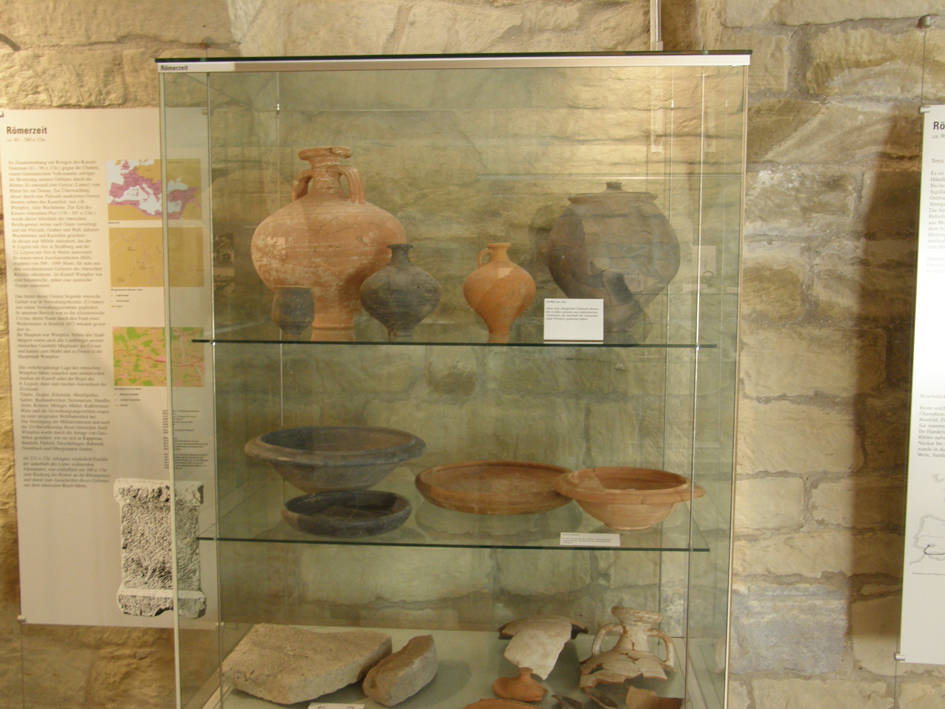 Mit der Vorverlegung der römischen Reichsgrenze gegen Ende des 1. Jahrhunderts n. Chr. vom Rhein an den Neckar und später noch weiter nach Osten wurde unser Gebiet ein Teil des römischen Weltreiches. Die römische Stadt Wimpfen entwickelte sich zu einem blühenden Zivil- und Verwaltungszentrum. Die zur Versorgung des Militärs und der Zivilbevölkerung angelegten Gutshöfe auf unserer Gemarkung profitierten von dieser Entwicklung. Zahlreiche Fundgegenstände aus dem Siedlungsbereich dieser römischen Gutshöfe sind in den Vitrinen 5, 6, 7 und 8 ausgestellt. Die Vitrinen 5 und 6 enthalten neben den in unserer Gegend hergestellten Keramiken auch Gefäße aus Terra sigillata, die aus Töpfereien in Süd-, Mittel-, Ost-Gallien und der Pfalz hierher gehandelt wurden. Weit hertransportiert wurden auch Ölamphoren aus Südspanien und Mühlsteine aus der Eifel.