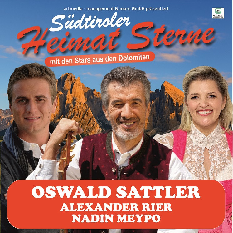 Heimatsterne sind die hellsten und kraftvollsten Botschafter ihrer Region – sie schenken Licht, Wärme und Geborgenheit. Genau dieses Gefühl bringen die „Südtiroler Heimatsterne“ auch 2026 wieder auf die Bühnen im deutschsprachigen Raum. Mit dabei sind die fernsehbekannten Stars aus Südtirol: Oswald Sattler, Alexander Rier sowie die beliebte Entertainerin und Sängerin Nadin Meypo. Gemeinsam präsentieren sie die schönsten musikalischen Höhepunkte aus ihrer Heimat – authentisch, emotional und voller Lebensfreude.