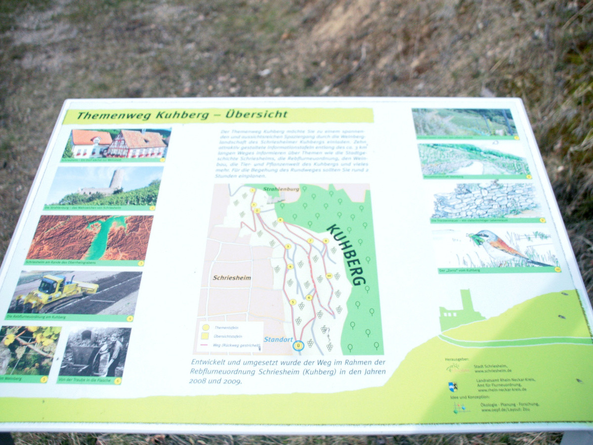 Der als Rundweg angelegte Themenweg bietet neben herrlichen Ausblicken auf das Rheintal und das Nordpfälzer Bergland auch interessante Einblicke in die Geschichte der Stadt Schriehsiem und der Strahlenburg, den Weinbau und die Tier- und Pfanzenwelt der Weinberglandschaft.