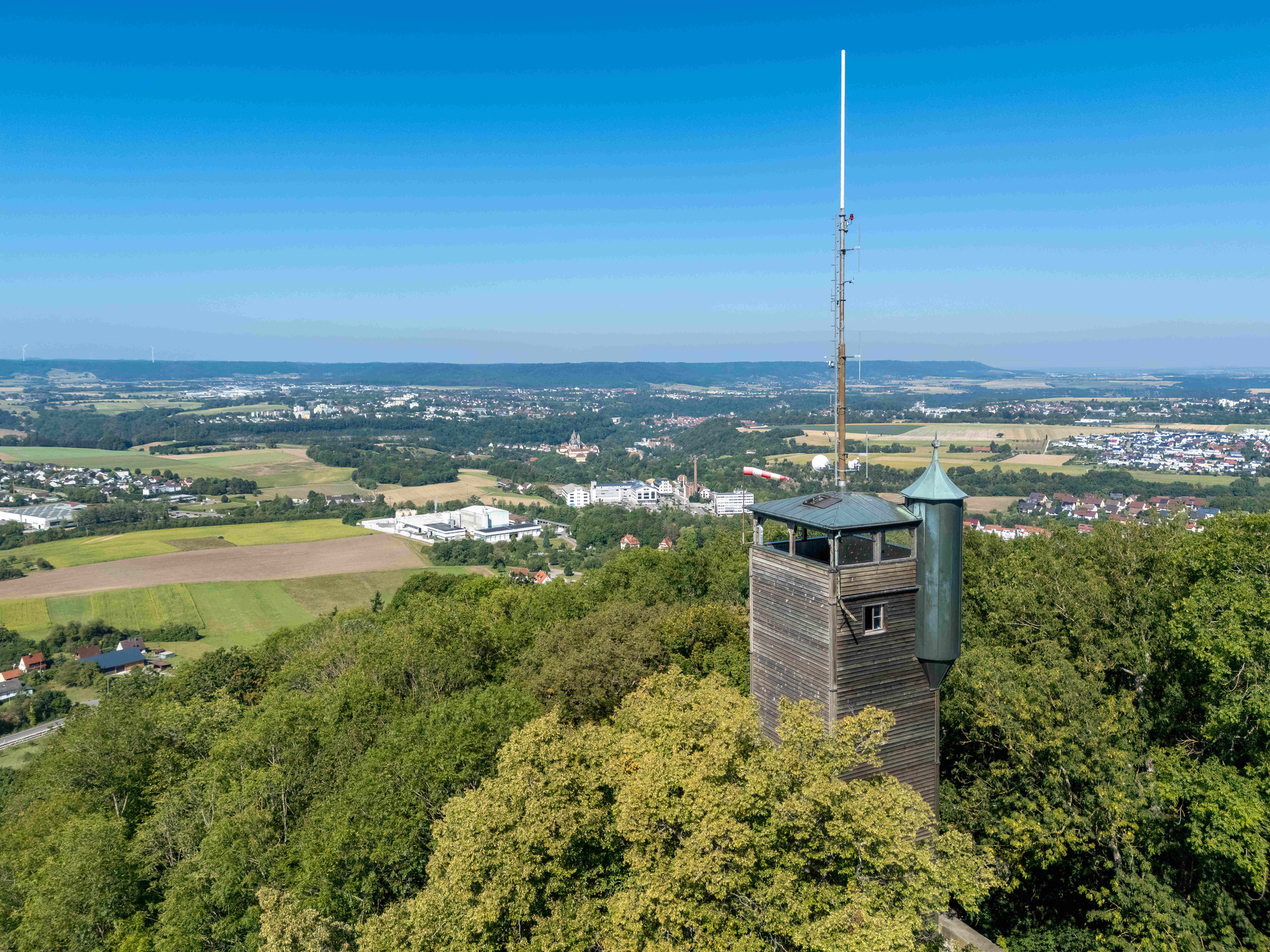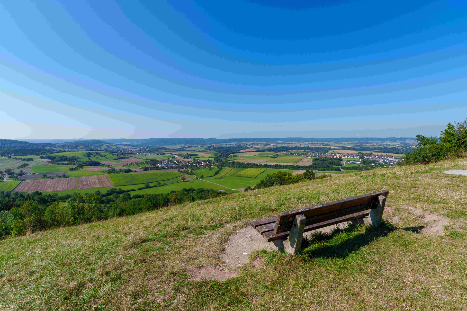 Genießen Sie nach erfolgreichem Aufstieg den Ausblick vom Einkorn aus auf das Hohenloher Land.