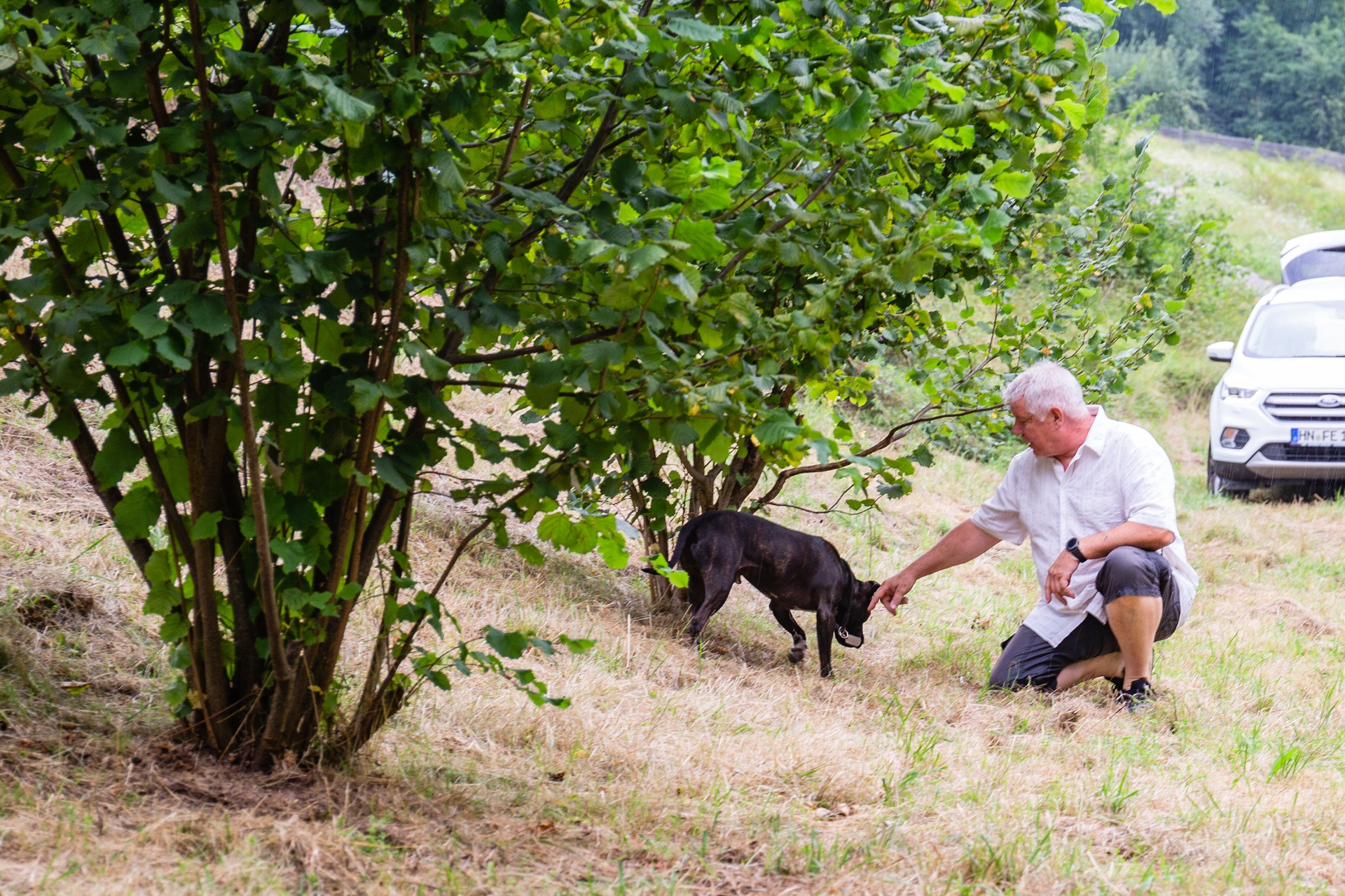 Nach der Theorie folgt die Praxis. Nur rund 500m sind es zur Trüffelanlage und man steht sozusagen auf "getrüffeltem Boden". Während dem Spaziergang durch die Trüffelplantage erleben die Teilnehmer den (Trüffel-)Hund live bei der Arbeit - die Suche nach dem Pilz beginnt. Und wenn alles klappt, können die Teilnehmen einen ersten eigenen Trüffel auch selbst "remontieren" - wie der Fachmann das Ausgraben der Trüffel nennt.