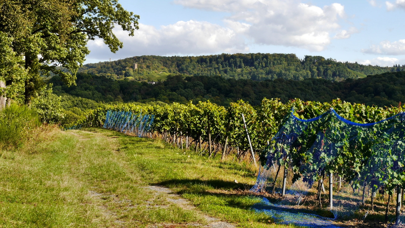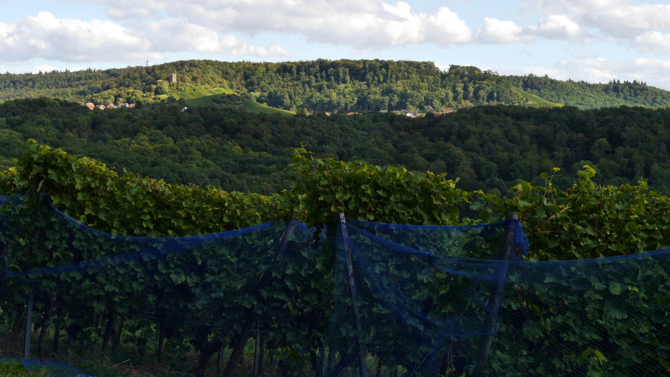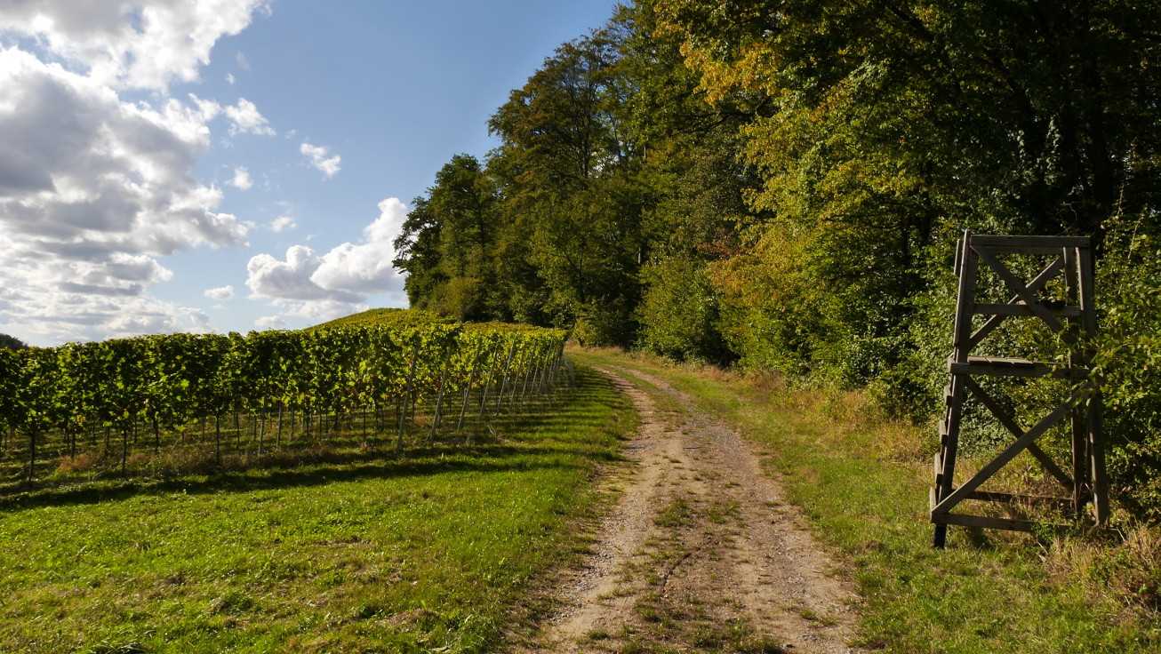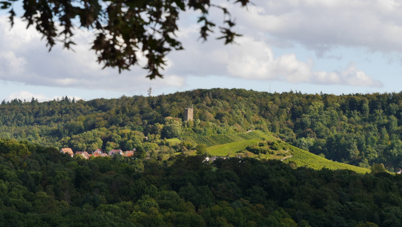 Vorbei an einem Teich bei einem Industrieanwesen wird der Waldrand erreicht. Zunächst hier entlang, dann links auf einem Pfad hinab in die Nähe der Landstraße nach Oberderdingen. Parallel zur Straße führt der Wanderweg dann oberhalb der Oberderdinger Weinberge über den "Hagenrain". Von hier aus hat man einen schönen Ausblick über das obere Kraichtal und zum Schlossbergturm in Sternenfels.