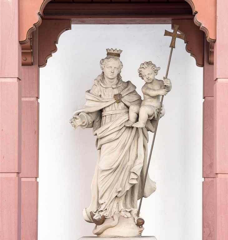 Das Werk zeigt eine deutliche stilistische Nähe zu Werken von Peter Anton von Verschaffelt, die der Hofbildhauer des Kurfürsten Carl Theodor zwischen 1760 und 1769 in Anlehnung an den Kanon der klassischen Antike für den Schlossgarten schuf. Die Krone mit 12 Sternen, das Zepter und die Mondsichel der Himmelskönigin und vor allem der Lanzenstoß des Christuskindes definieren den Typus der Maria vom Siege bzw. Mondsichelmadonna. Eine Kopie der Figurengruppe bekrönt – in vertauschter Anordnung der Attribute – den Kirchengiebel.