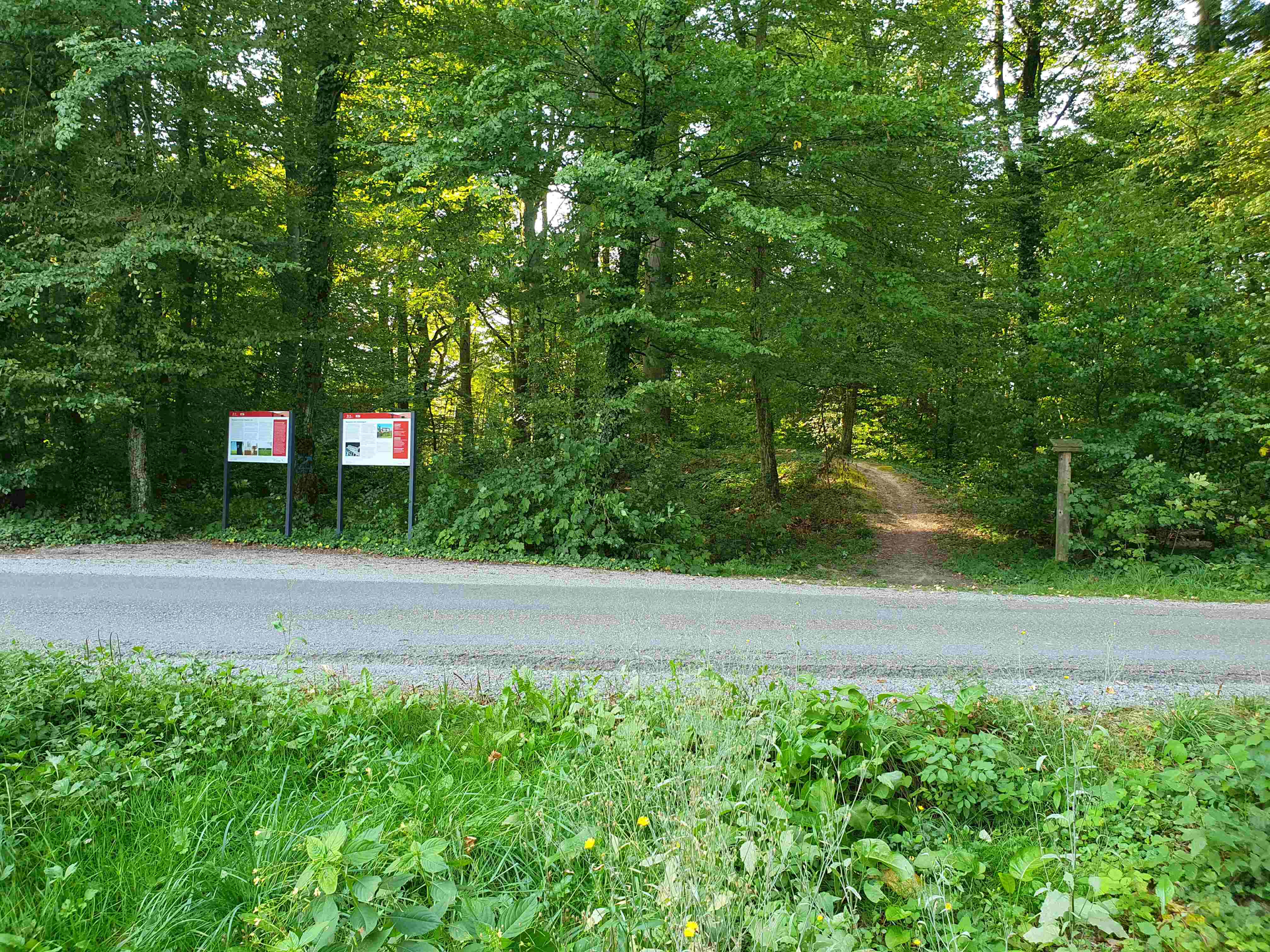 Ausgehend vom Wanderparkplatz zwischen Westernbach und Pfahlbach gehen wir barrierefrei bis zum Wall- und Grabenrest, der vom Kärchersträßle durchtrennt wird.