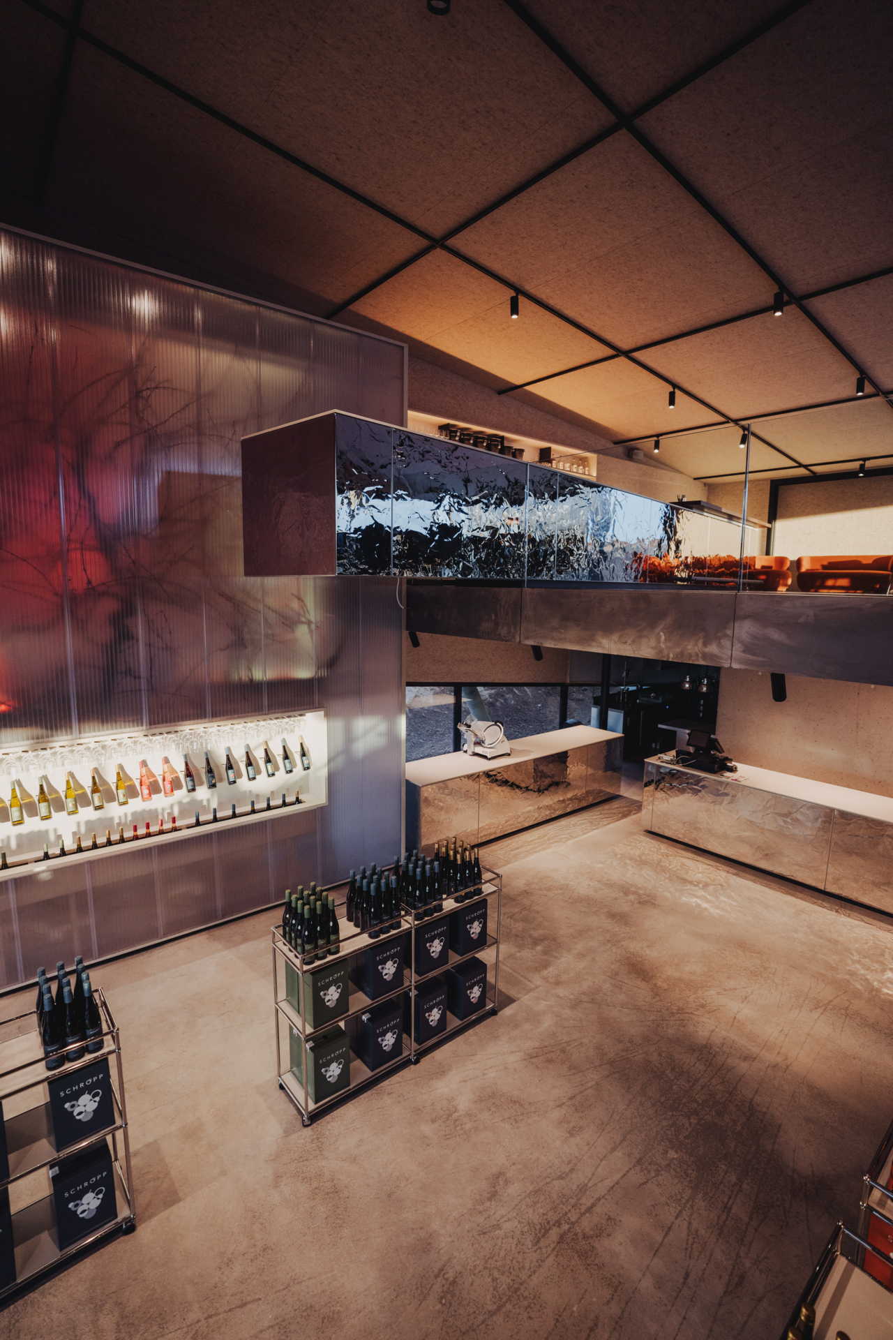 Wie über eine Landebahn nähert der Besucher sich vom Parkplatz aus der Vinosphäre. Vorbei an den kreisrunden Designelementen, die sich überschneiden und einander umkreisen, erreicht man das moderne Weingut. Die Fassade, die durch Aussparungen den Blick in das Innere des Weinguts mit seiner speziellen Formsprache rahmt, umgibt ein Weinerlebnis auf zwei Ebenen.