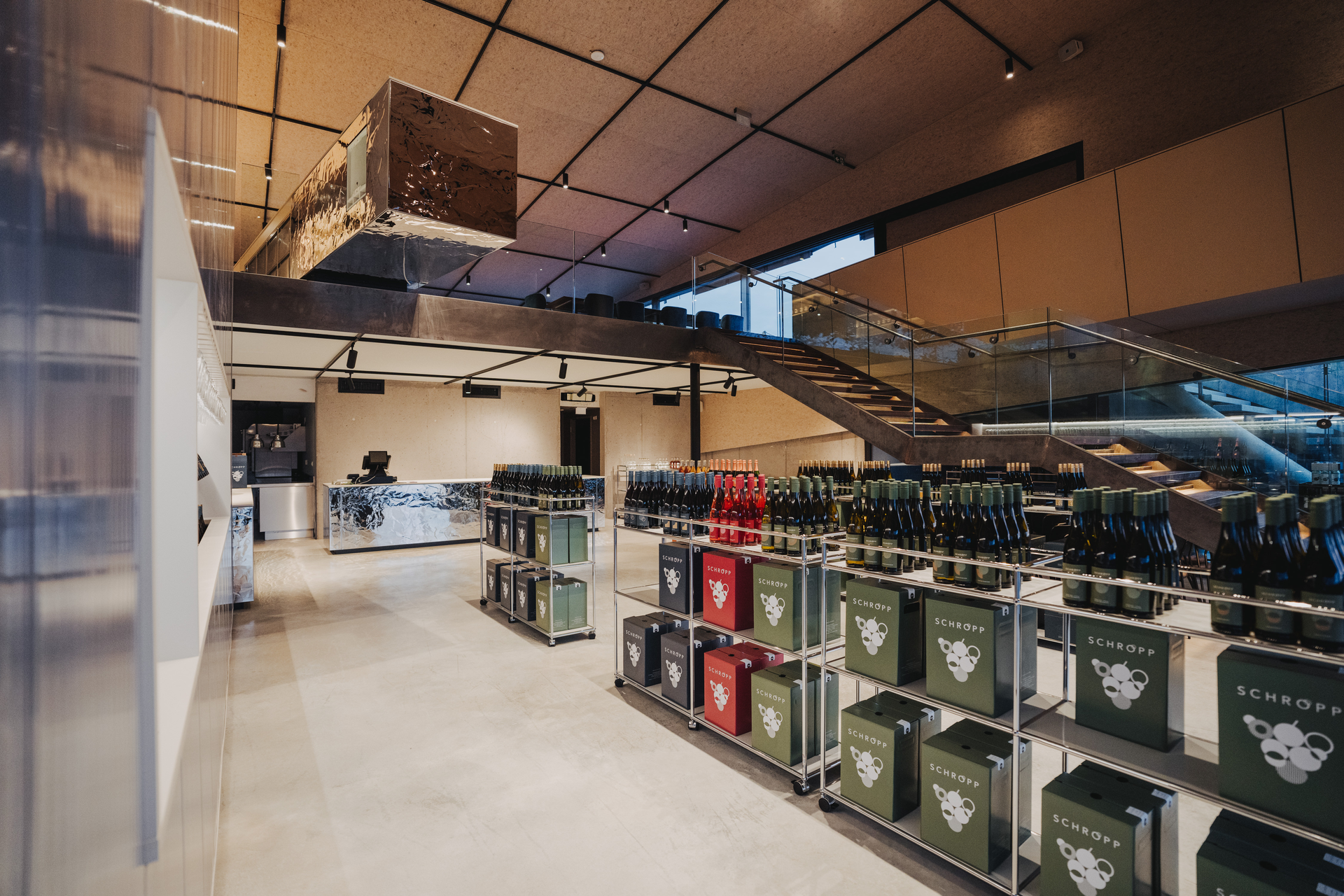 Im Erdgeschoss wandert der Besucher in der Vinothek durch das Sortiment des Weingut Schropp. Am Wein Kabinett besteht die Möglichkeit, eine Auswahl der Weine selbstständig und kostenlos zu probieren.