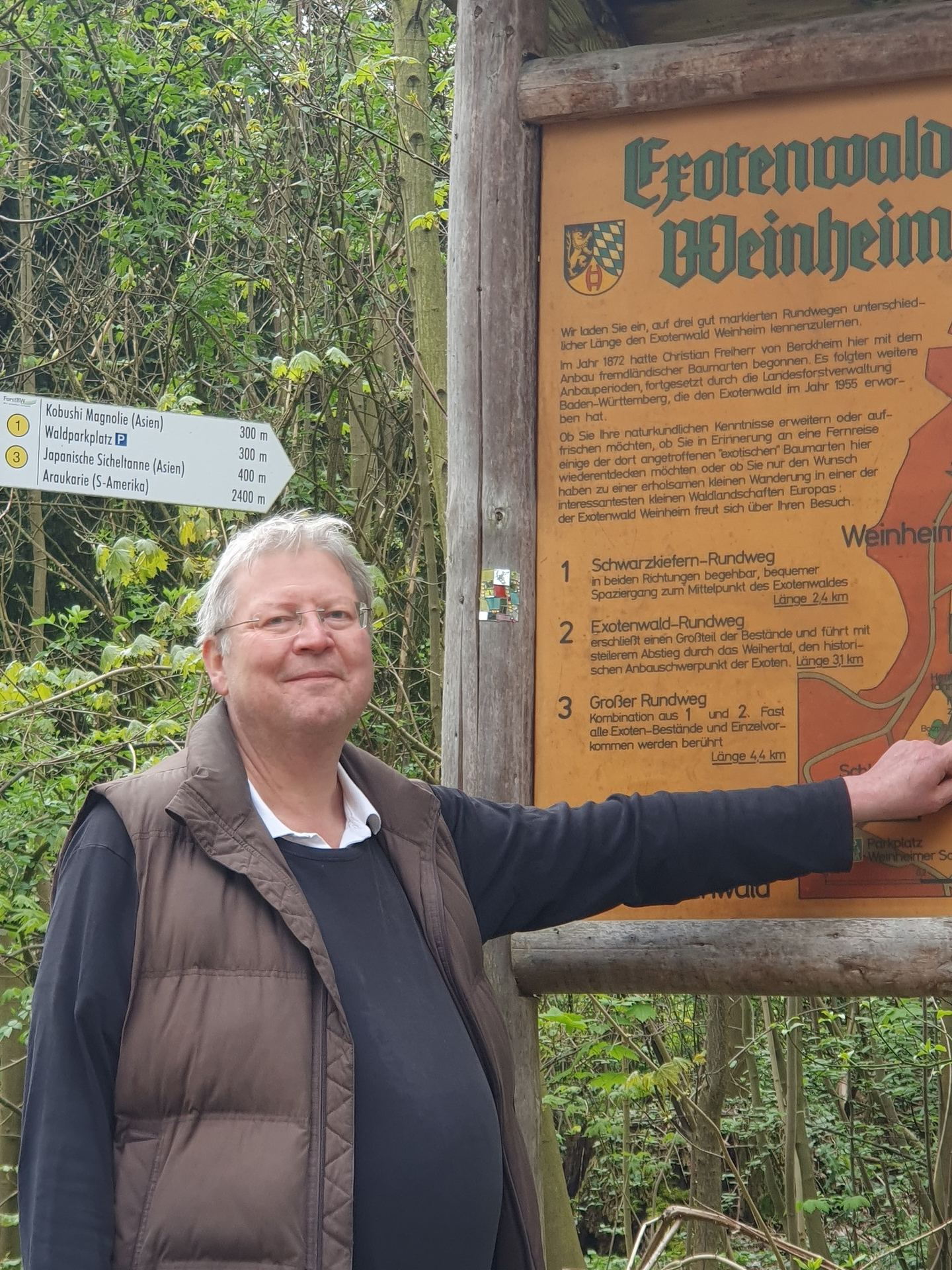 Der Stadtführer zeigt auf die Wandertafel im Exotenwald | © Dietmar Spicker