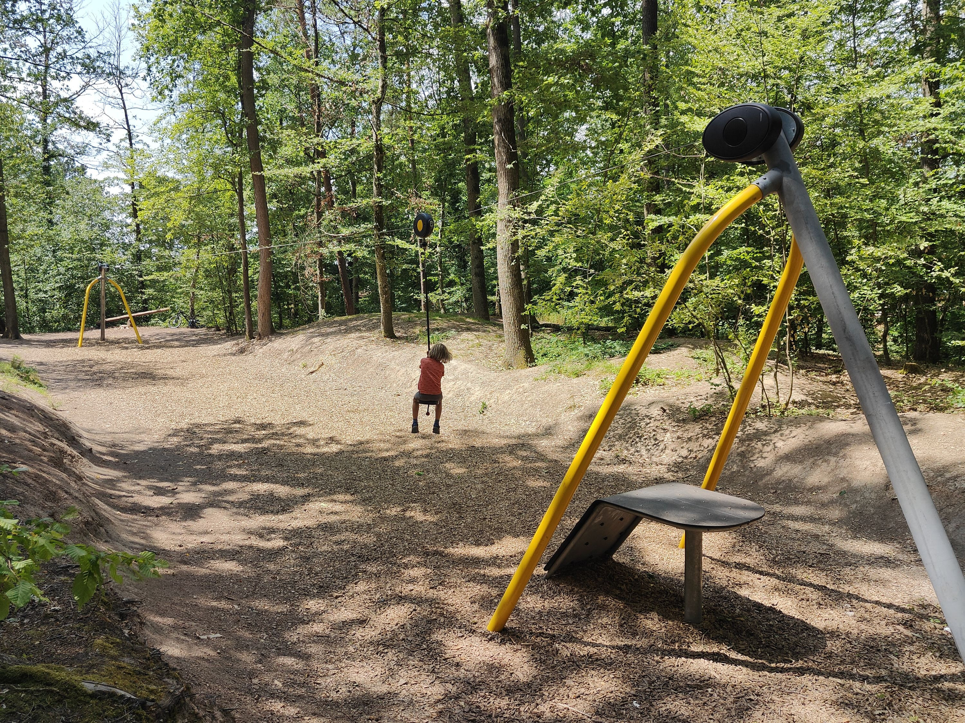 Großzügig angelegter Waldspielplatz mit Kletterturm, Rutsche, Wippe und Seilbahn. Das gesamte Gelände lädt zum Toben ein.