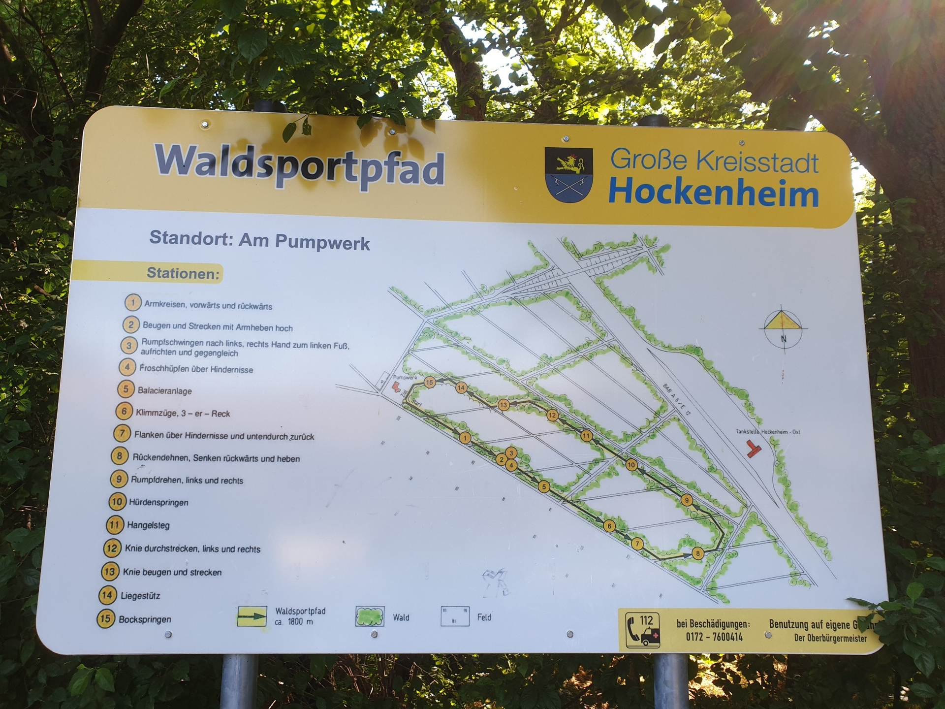 Sportbegeisterte Menschen erwartet im Stadtwald der Waldsportpfad. Er ist im Pumpwerkweg, ca. 50 Meter hinter dem Pumpwerk Hockenheim zu finden. Der Waldsportpfad umfasst eine Strecke von 1,8 Kilometern. Er enthält 15 Stationen mit abwechslungsreichen Betätigungsarten. Dazu gehört eine Slackline, auf der Besucher ihren Gleichgewichtssinn trainieren können. Außerdem sind beispielsweise Hangelstege, ein Dreier-Reck sowie Bewegungs- und Balancier-Anlagen vorhanden. Armkreisen, Froschhüpfen, Rumpfdrehen, Hürdenspringen oder Liegestützen machen sind weitere Möglichkeiten der Bewegung.