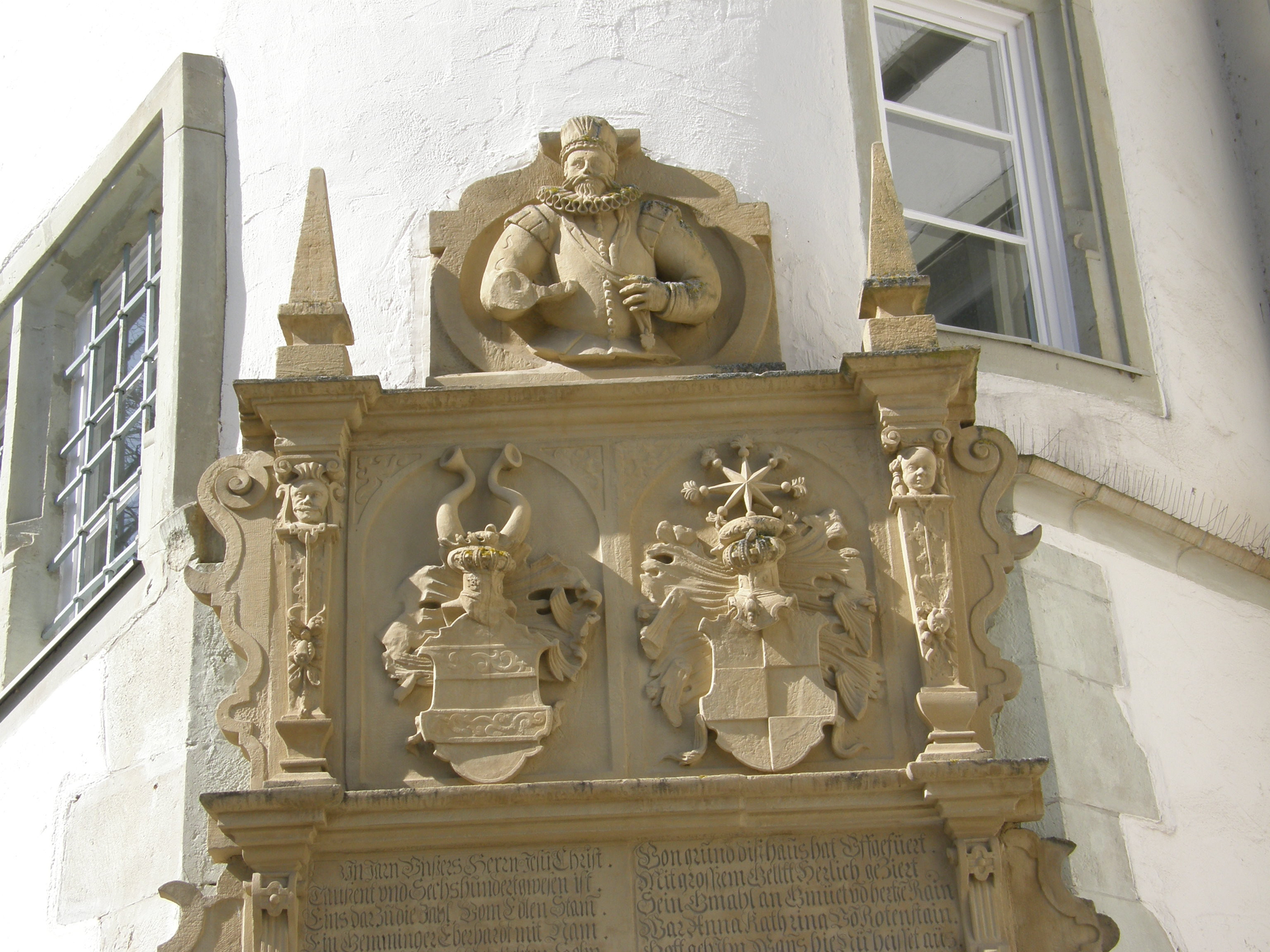 Sehenswert ist vor allem das schmucke Spätrenaissance-Portal am Treppenturm, dessen oberen Abschluss ein aus Sandstein gefertigtes Brustbild des Bauherrn ziert. Unter dem Brustbild des Ritters sehen wir das in reicher Steinmetzarbeit ausgeführte Allianzwappen Gemmingen-Rodenstein.