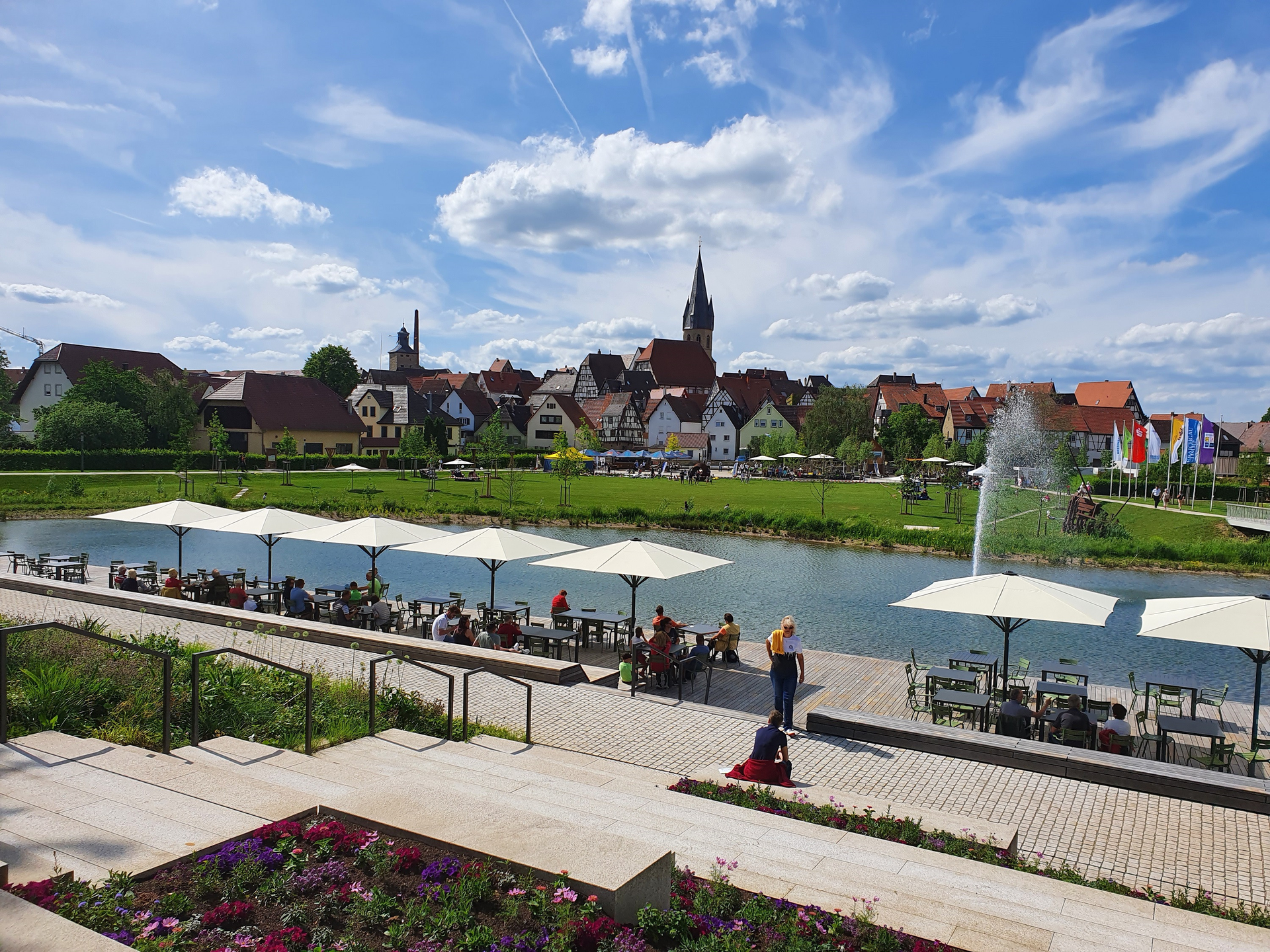 Von den "Weiherterrassen" - ein schönes Sonnendeck mit treppenartigen Sitzgelegenheiten - fällt der Blick über den See auf die Kulisse der historischen Altstadt. In der warmen Jahreszeit mit Bewirtung direkt am See.