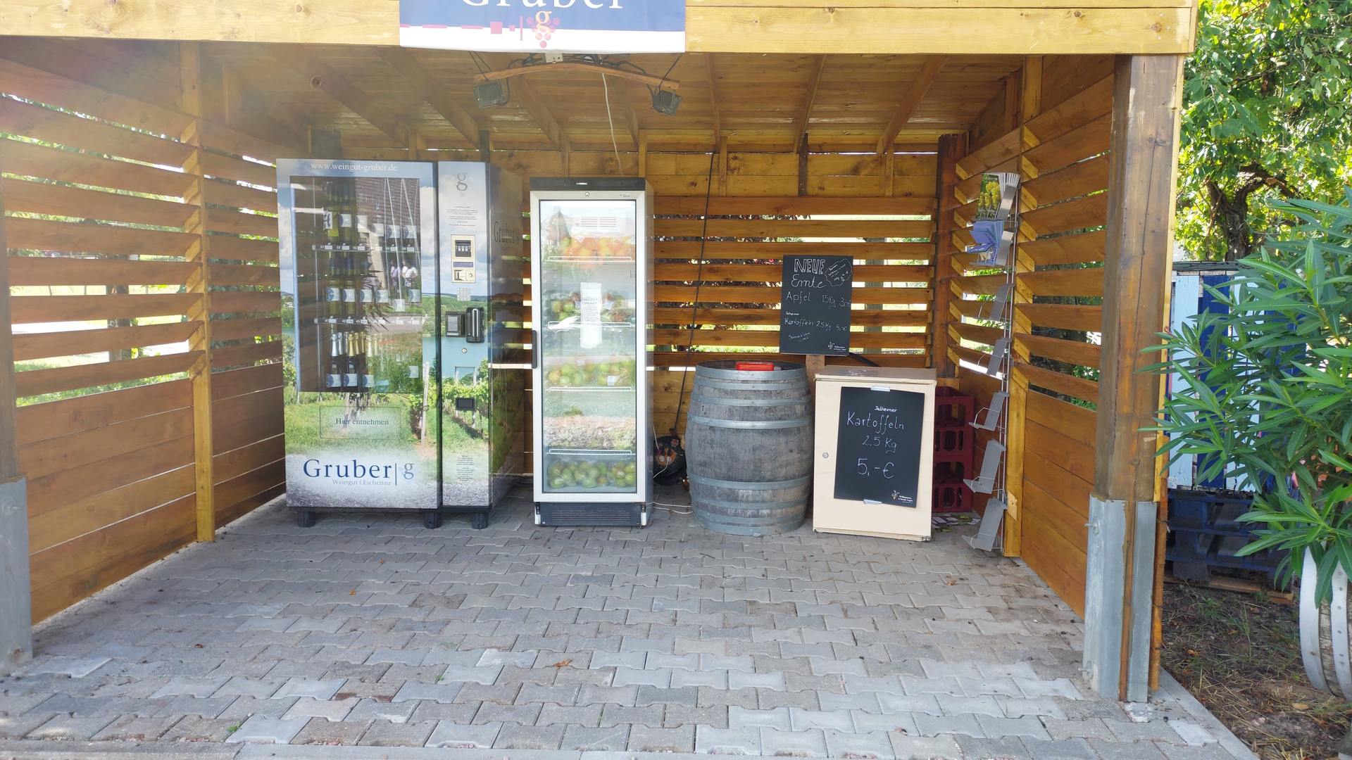Im Weinautomat am Weingut Gruber steht eine kleine Auswahl aus dem Sortiment des Weinguts zur Verfügung. Direkt am Weinautomat befinden sich ein Apfelkühlschrank sowie schöne, gemütliche Sitzgelegenheiten, die zum Verweilen einladen.