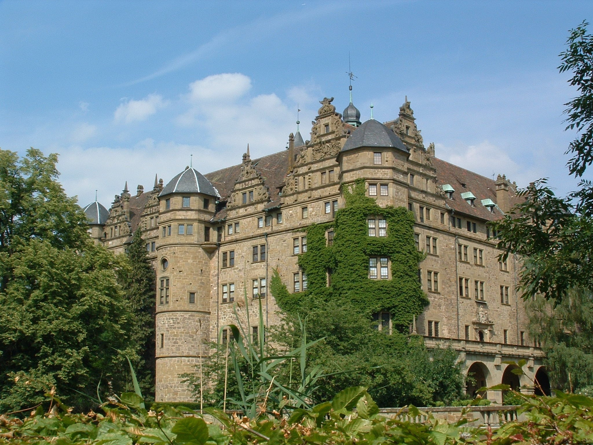 Bald danach fließt der Kesselbach in Richtung Neuenstein und der Gehweg folgt der K 2355 ins nahe Städtle. Neuenstein wird überragt von den Schlosstürmen, der Stadtkirche und dem Bürgerturm. In der Altstadt mit ihren Fachwerkhäusern befindet sich das malerische Rathaus. Gleich nebenan weist eine Gedenktafel an einem Haus darauf hin, dass hier Goethes Ururgroßvater Johann Wolfgang Textor 1638 geboren wurde. Unweit davon, an der Apotheke in der Hinteren Straße, finden Sie einen weiteren Hinweis: „Geburtshaus des Hohenloher Dialektdichters Wilhelm Schrader „Gäwele“, geb. 12. Januar 1847, gestorben zu Ulm 1914“. Seine „Hohenloher Gschichddlich vum alte Gäwele“ sind mit deftigem Humor durchzogen. Der fürstliche Leibjäger und Förster Gäwele hatte im nahen Michelbach am Wald bis hin zu den Wanderwegen auf dieser Tour sein Revier.