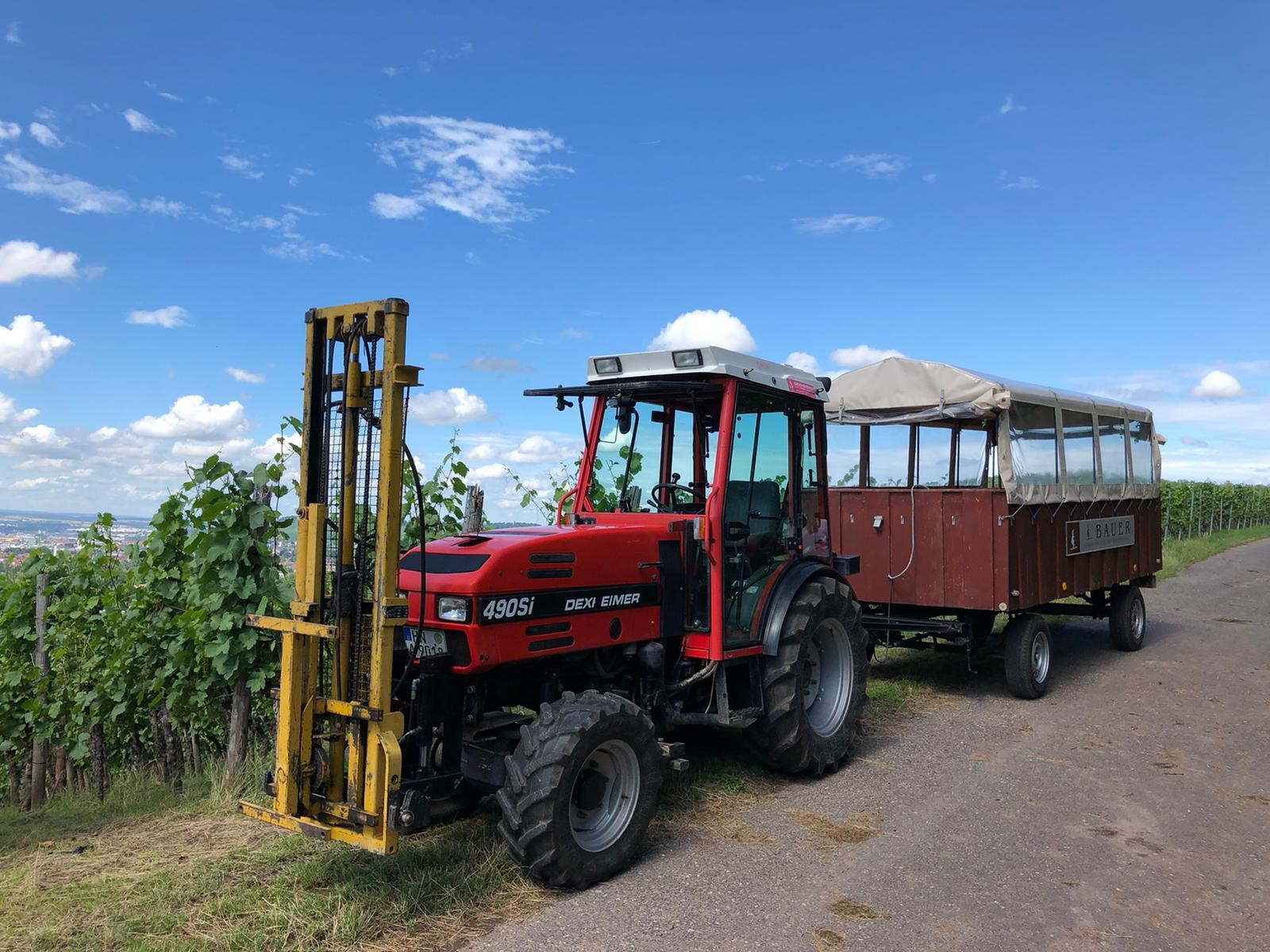 Der Planwagen vom Weingut Bauer bietet Platz für bis zu 20 Personen. Ausgestattet mit einem Tisch in der Mitte, großen Fenstern und einer Plane als Witterungsschutz geht auf Panoramatour durch die Weinberge.