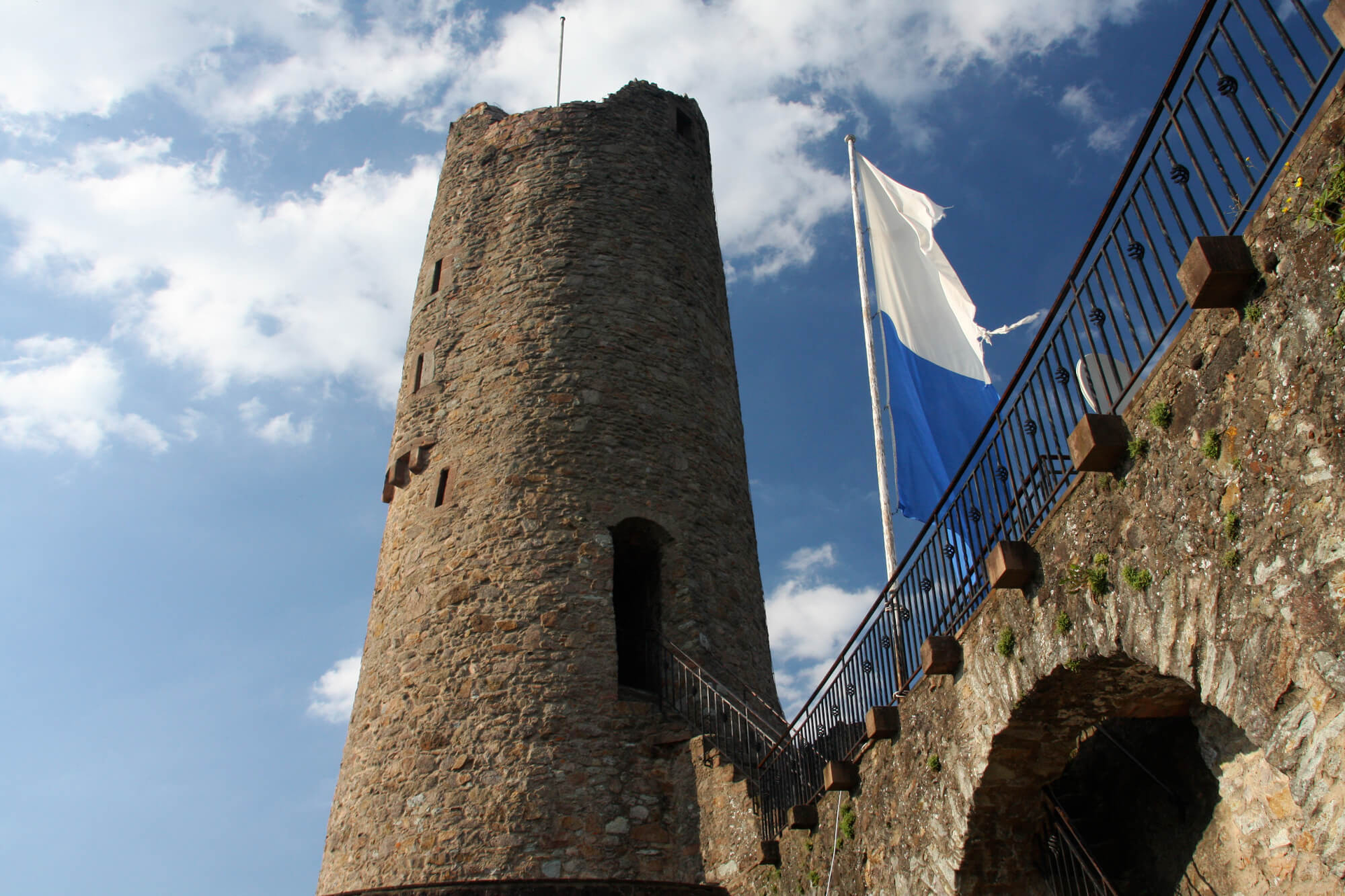 Turm der Burgruine Windeck mit Beflaggung vor strahlend blauem Himmel. | © Maria Zimmermann