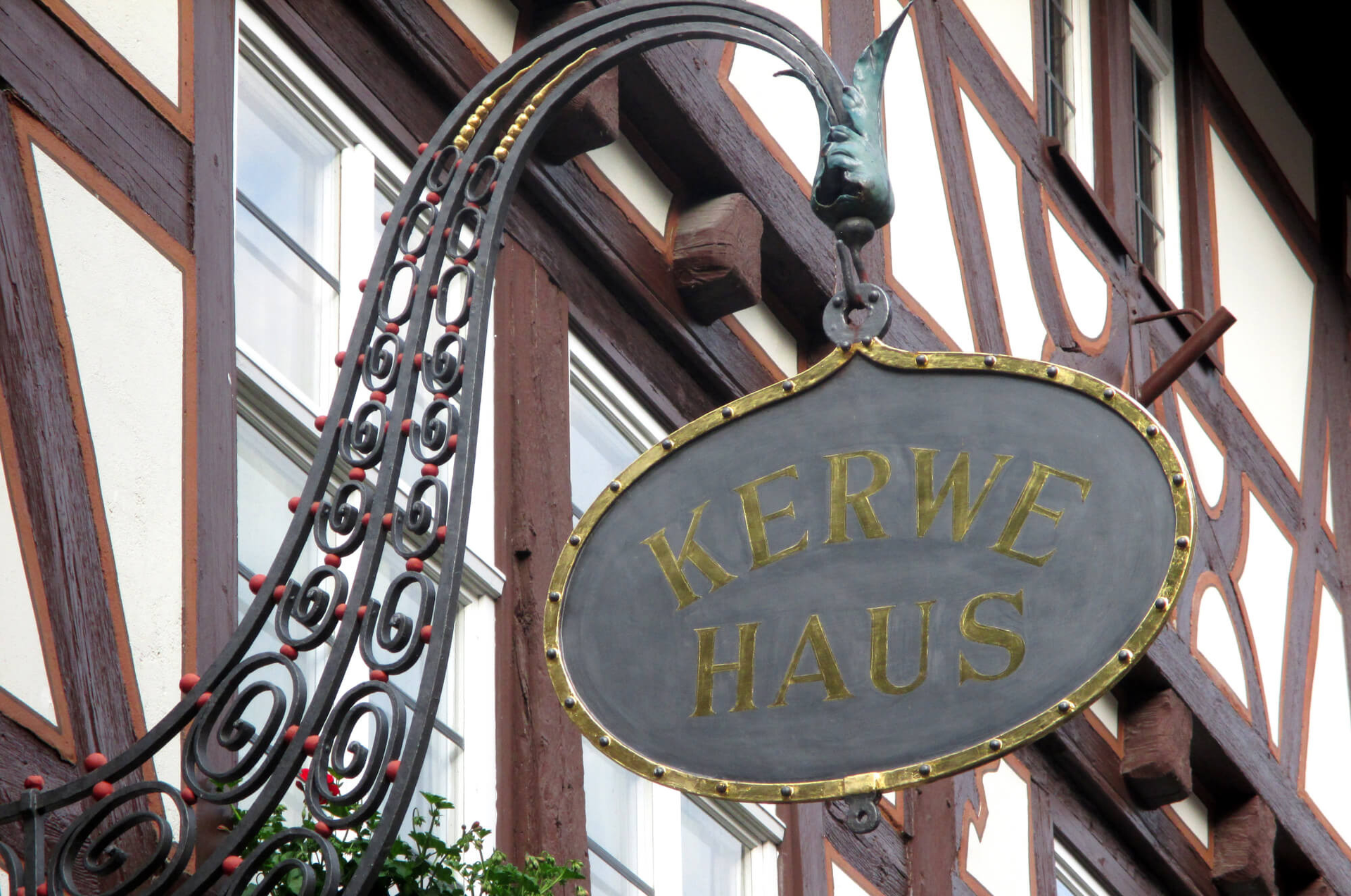 Ein altes schmiedeisernes Schild mit Schriftzug Kerwehaus an einer Fachwerkfassade. | © Maria Zimmermann